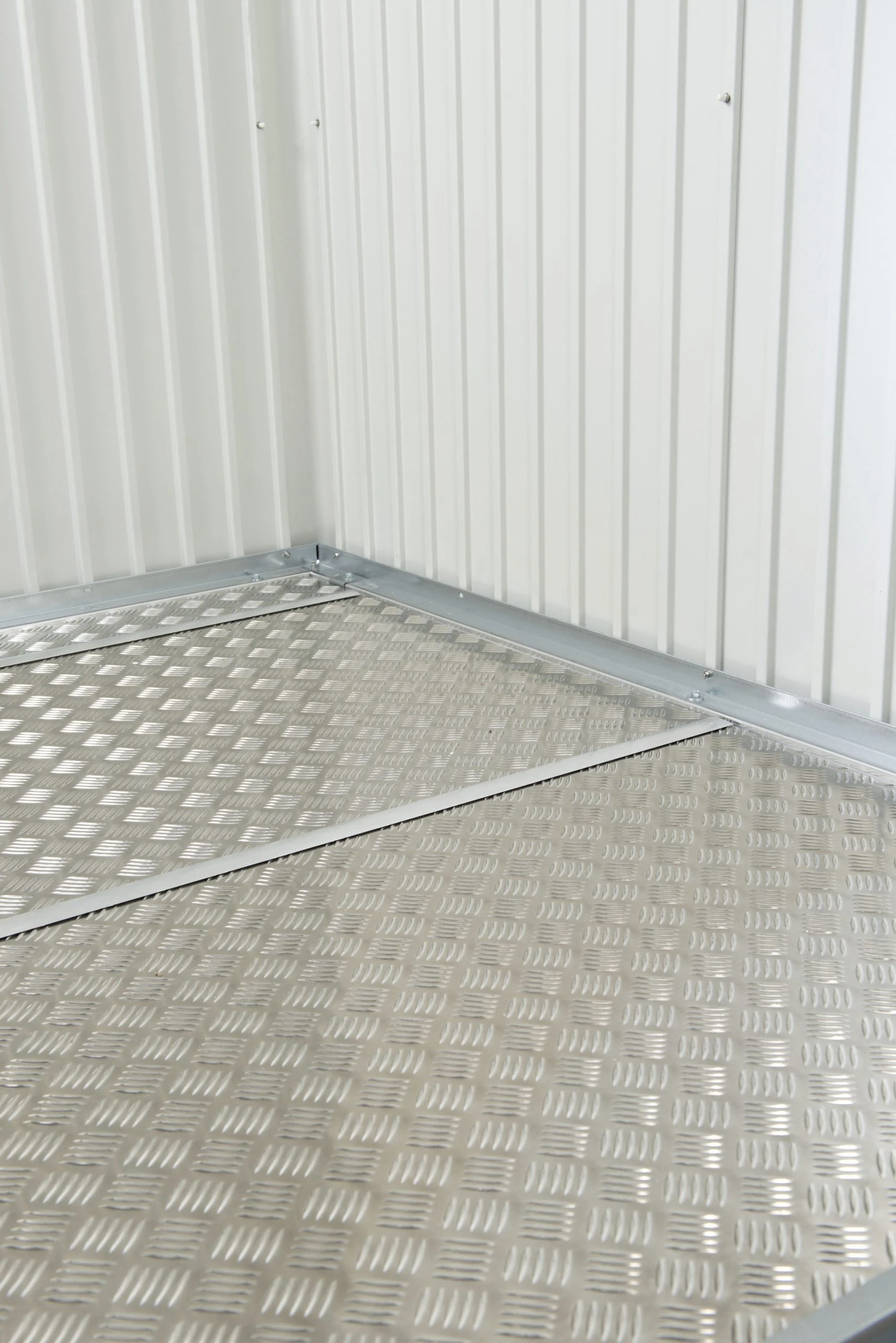 Hochwertiger Alu-Riffelblechboden, elegant und funktionell. Der Boden besteht je nach Hausgröße aus 3 bis 5 Segmenten inklusive Verbindungsschienen. Zur optimalen Verlegung der Alu-Bodenplatten ist der Alu-Bodenrahmen erforderlich.