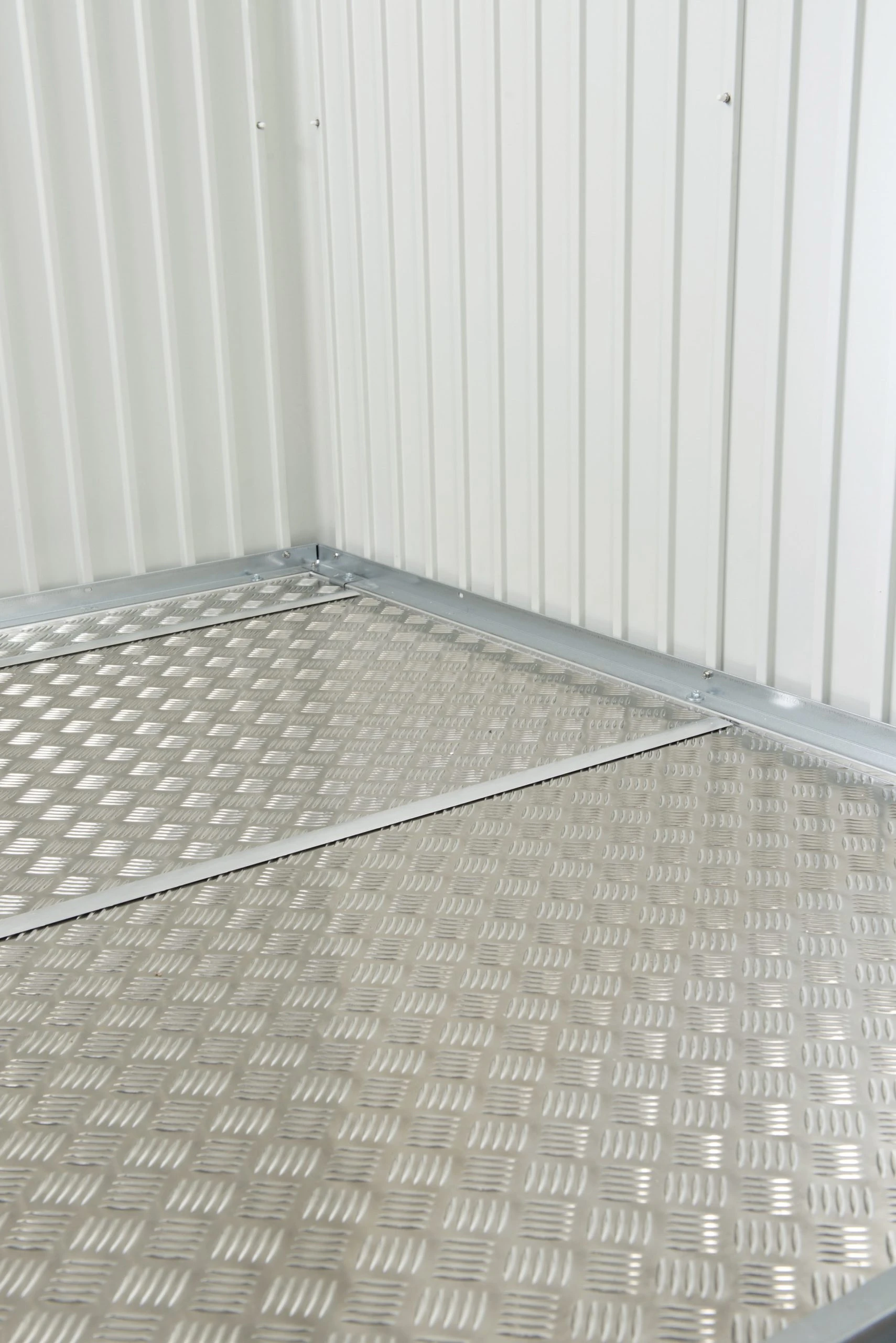 Hochwertiger Alu-Riffelblechboden, elegant und funktionell. Der Boden besteht je nach Hausgröße aus 1 bis 5 Segmenten inklusive Verbindungsschienen. Zur optimalen Verlegung der Alu-Bodenplatten ist der Alu-Bodenrahmen erforderlich. Beachten Sie bitte, dass die ALU-Bodenplatte mit einer Schüttung oder XPS-Hartschaumplatten in einer Stärke von ca. 2-3 cm zu unterfüttern ist (nicht im Lieferumfang enthalten).