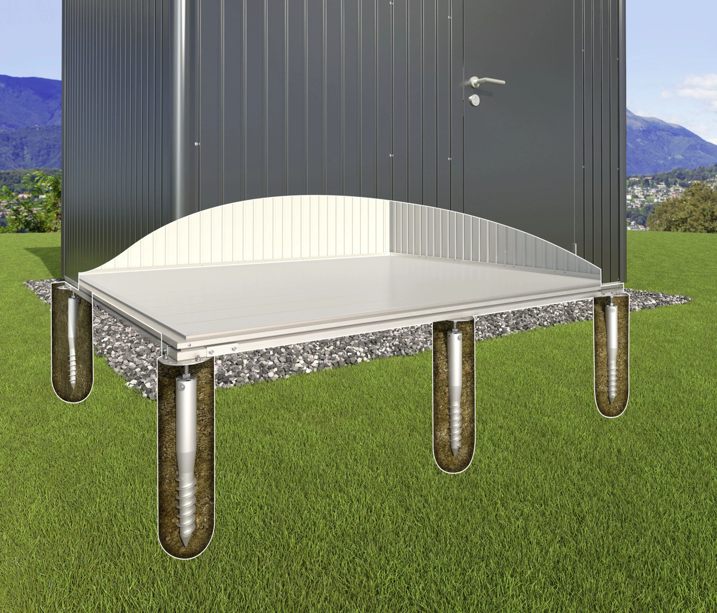 Das patentierte SmartBasePLUS Fundament verfügt über Erdschrauben. Diese werden direkt in das Erdreich gerschraubt und können Gefälle bis zu 15 cm ausgleichen. Hierfür sollte der Boden kompakt und frei von großen Steinen und Wurzeln sein.