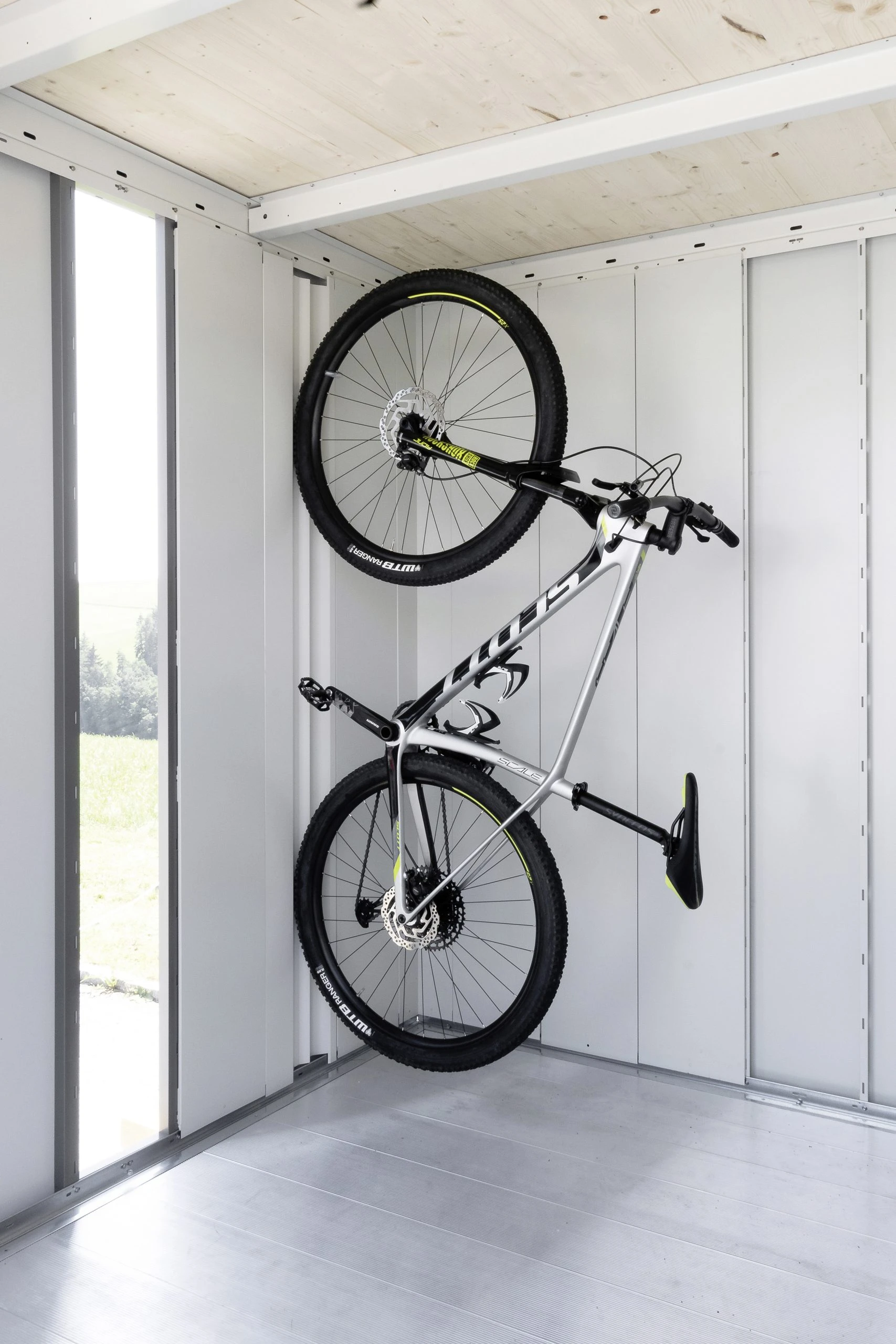 Mit der Fahrradaufhängung bikeMax können Sie Ihre Fahrräder bis zu einer Größe von 29-Zoll platzsparend in Ihrem Gerätehaus Neo aufbewahren. Der Aufhängehaken ist zudem 8-fach höhenverstellbar. Überdies ist eine Absperröse für Fahrradschlösser bereits integriert.