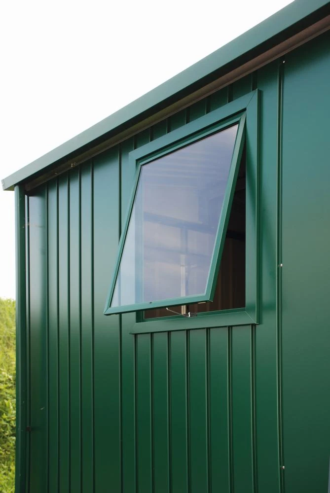 Das komplette Seitenwandelement mit Metallrahmen-Ausstellfenster (Kunststoffglas) bringt Tageslicht ins Gerätehaus. Lieferumfang: Komplettes Seitenwandelement (B 73,4 x H 176 cm) mit fertig eingebautem Ausstellfenster, Plexiglas, Metallrahmen