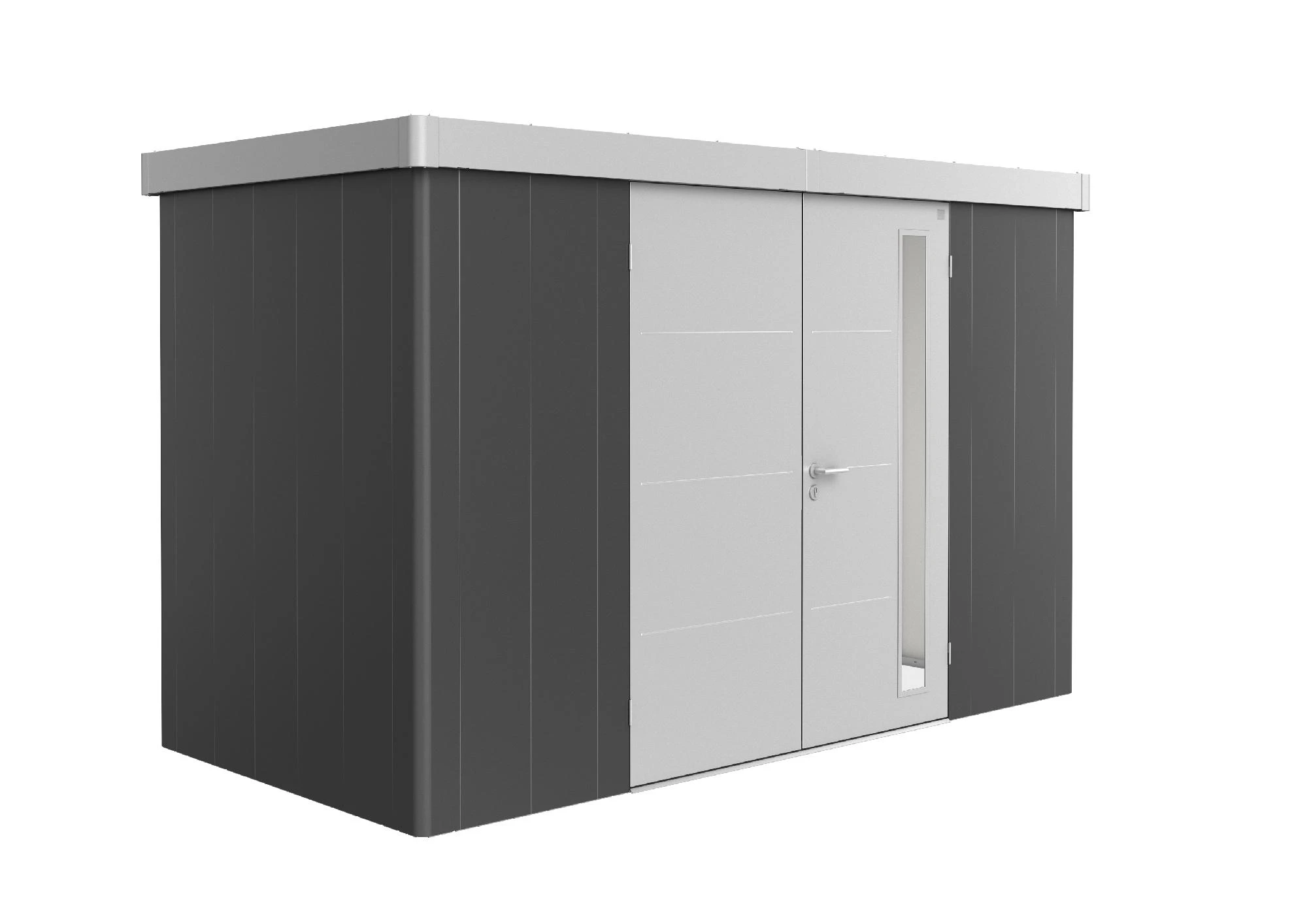 - Farbe: Wandfarbe: dunkelgrau-metallic, Tür- und Dachfarbe: silber-metallic