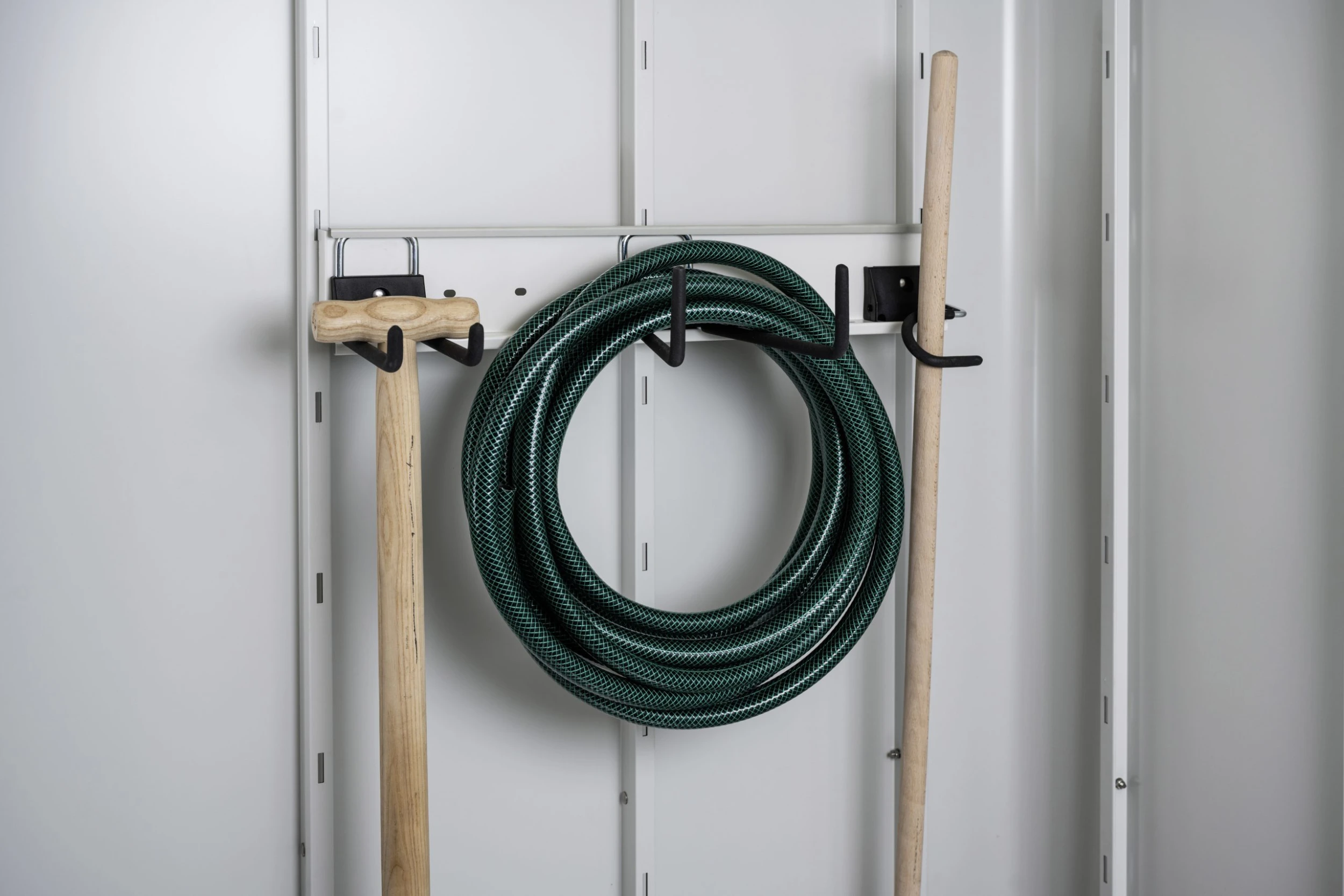 Set bestehend aus je einem Kombi-, Stiel- und Schaufelhaken und einer Wandschiene. Auch in Kombination mit der Innenverkleidung montierbar.