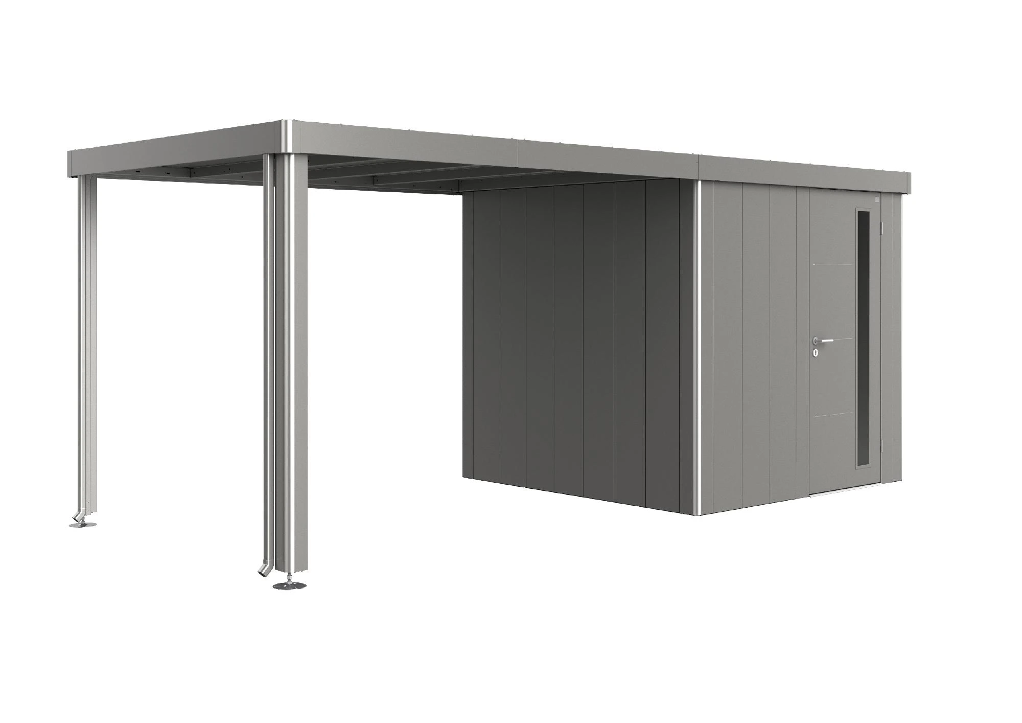 Das Seitendach wird am Gerätehaus Neo (ab Gr. 2A) wahlweise ein- oder beidseitig fixiert. Die Breite des Seitendaches liegt bei 3 m. Die Alu-Stützen sind mit höhenverstellbaren Füßen ausgestattet. Zwei Regenfallrohre sind inkludiert.