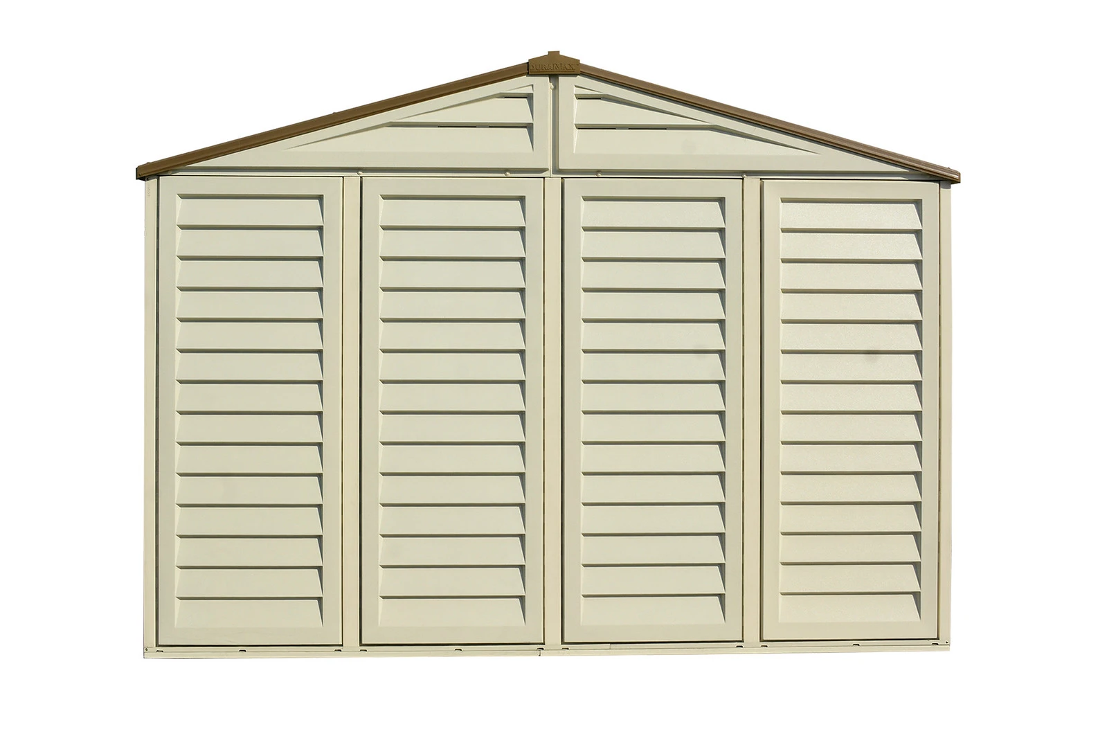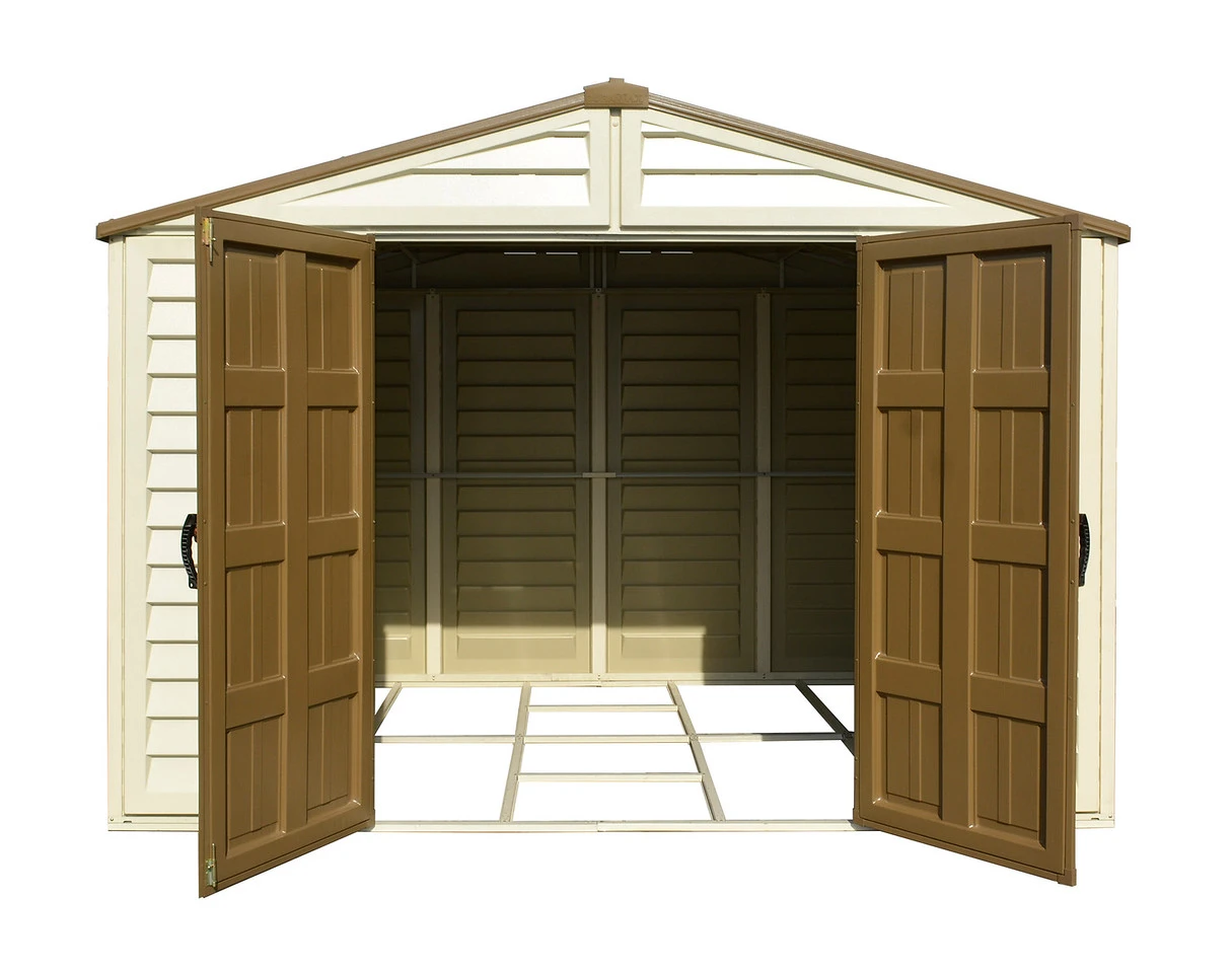 Wartungsfreies Gerätehaus aus Kunststoff Duramax WoodBridge Plus 7,6m2 mit Bodenrahmen, im modernen Design ausgeführt. Mit Doppeltür und einer großenTüröffnung für bequemen Zugang. Ideal zur Aufbewahrung von Gartengeräten und Zubehör.