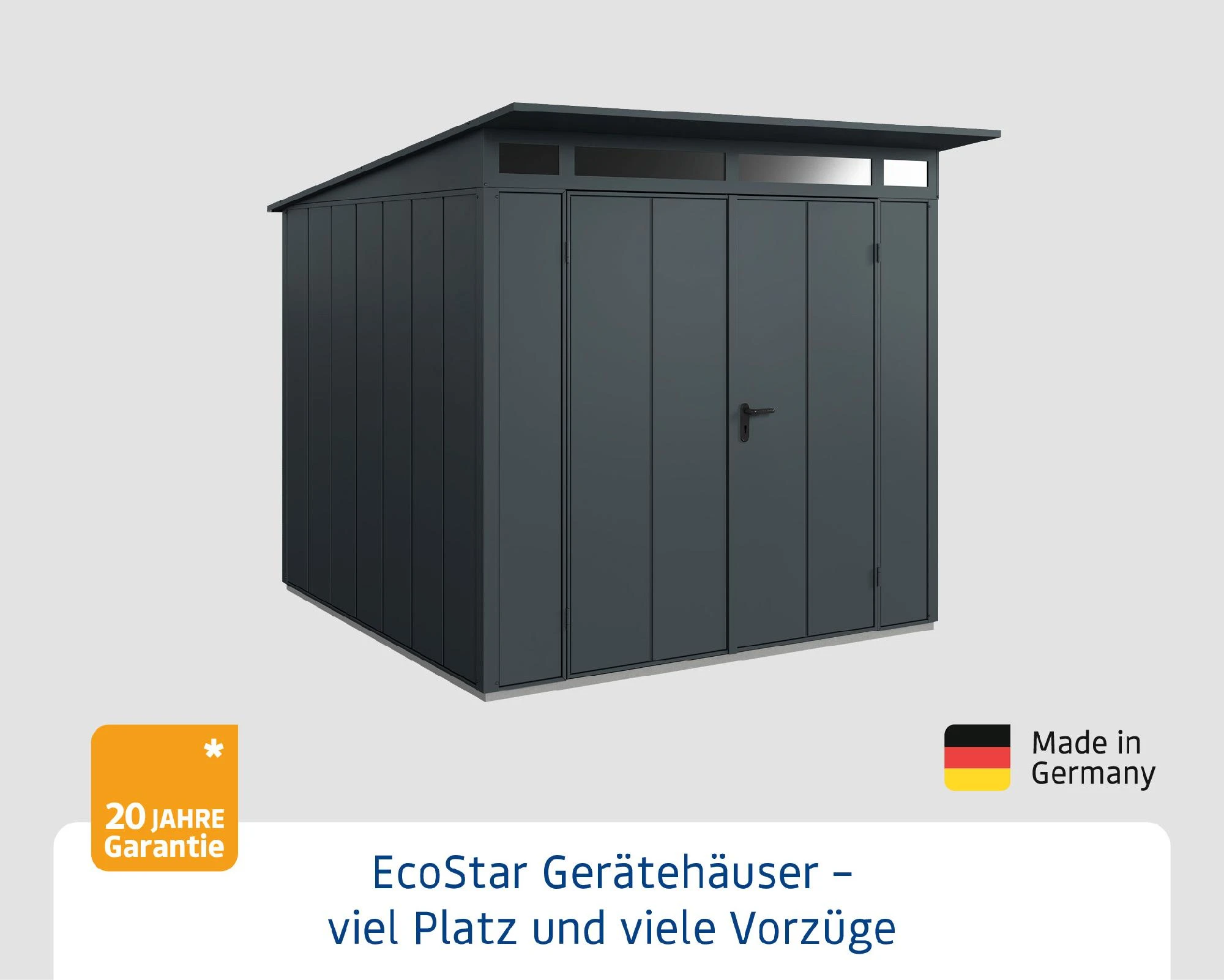 EcoStar Gerätehäuser mit Pultdach sind in zwei unterschiedlichen Motiven und einer Vielzahl von Ausführungen erhältlich. Alle Häuser bieten komfortable Lösungen mit cleverem Stauraum in verschiedenen Größen und Farben. Im Zusammenspiel mit dem funktionalen und praktischen Zubehör findet sich für alles der optimale Platz. Die Häuser werden in einem maximalen Vorfertigungsgrad angeliefert. Der stabilisierende Alu-Bodenrahmen ist bereits im Preis enthalten. Aufbau und Montage gestalten sich damit einfach, schnell und unkompliziert. EcoStar Gerätehäuser ELEGANT Pultdach sorgen mit ihrem breiten Motiv für einen modernen und ansprechenden Look. Langlebige und qualitativ hochwertige Materialien gewährleisten dabei eine sehr gepflegte Optik. Oberlichter sorgen für angenehmes Licht im Inneren und der Dachvorsprung schützt bei Regen. In drei unterschiedlichen Größen bieten diese Gerätehäuser viele Zubehöroptionen und ausreichend Stauraum für alles, was den Garten und die Freizeit lebenswert macht. Von Gartengeräten bis zum Fahrrad – alles ist sicher verstaut, dank zuverlässiger Schlösser und Bänder. Mit den Gerätehäusern von EcoStar schaffen Sie einen schönen Platz für Ordnung in Ihrem Garten