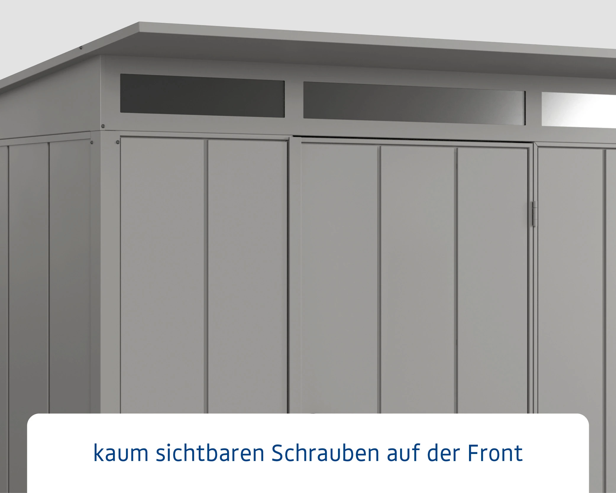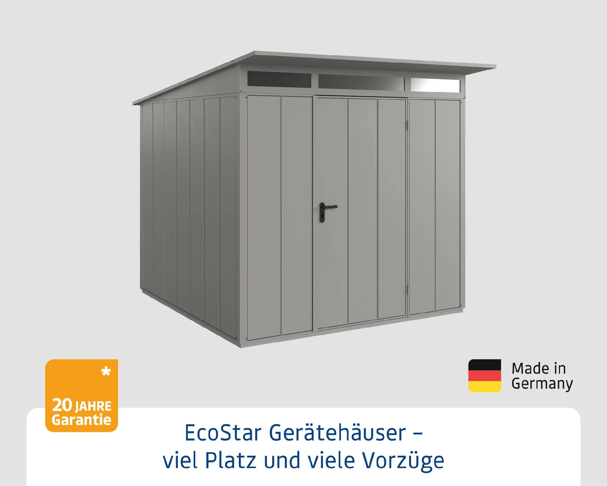 EcoStar Gerätehäuser mit Pultdach sind in zwei unterschiedlichen Motiven und einer Vielzahl von Ausführungen erhältlich. Alle Häuser bieten komfortable Lösungen mit cleverem Stauraum in verschiedenen Größen und Farben. Im Zusammenspiel mit dem funktionalen und praktischen Zubehör findet sich für alles der optimale Platz. Die Häuser werden in einem maximalen Vorfertigungsgrad angeliefert. Der stabilisierende Alu-Bodenrahmen ist bereits im Preis enthalten. Aufbau und Montage gestalten sich damit einfach, schnell und unkompliziert. EcoStar Gerätehäuser ELEGANT Pultdach sorgen mit ihrem breiten Motiv für einen modernen und ansprechenden Look. Langlebige und qualitativ hochwertige Materialien gewährleisten dabei eine sehr gepflegte Optik. Oberlichter sorgen für angenehmes Licht im Inneren und der Dachvorsprung schützt bei Regen. In drei unterschiedlichen Größen bieten diese Gerätehäuser viele Zubehöroptionen und ausreichend Stauraum für alles, was den Garten und die Freizeit lebenswert macht. Von Gartengeräten bis zum Fahrrad – alles ist sicher verstaut, dank zuverlässiger Schlösser und Bänder. Mit den Gerätehäusern von EcoStar schaffen Sie einen schönen Platz für Ordnung in Ihrem Garten