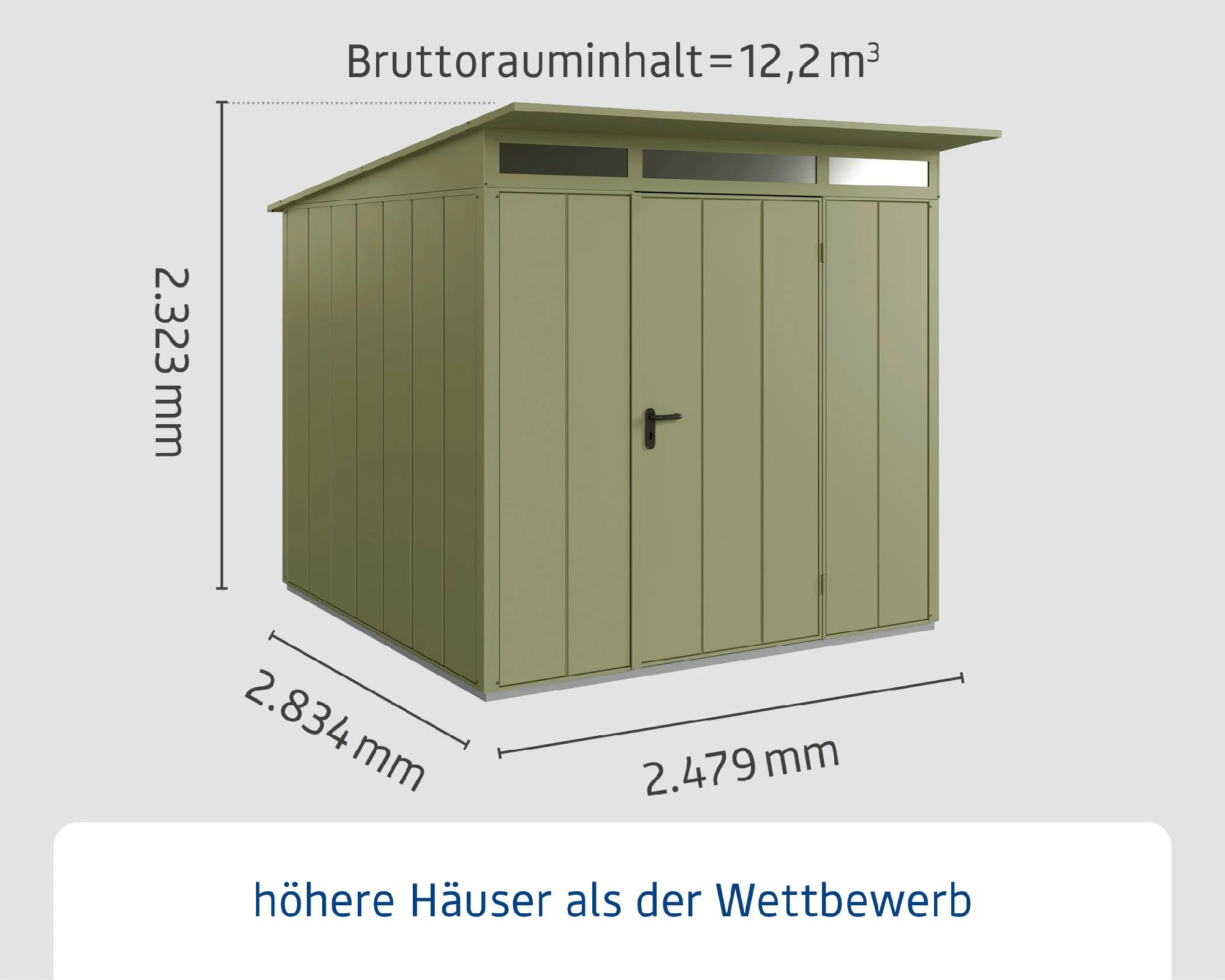 - Außenmaße inkl. Dachvorsprung (BxTxH): 247,9 x 283,4 x 232,3 cm
