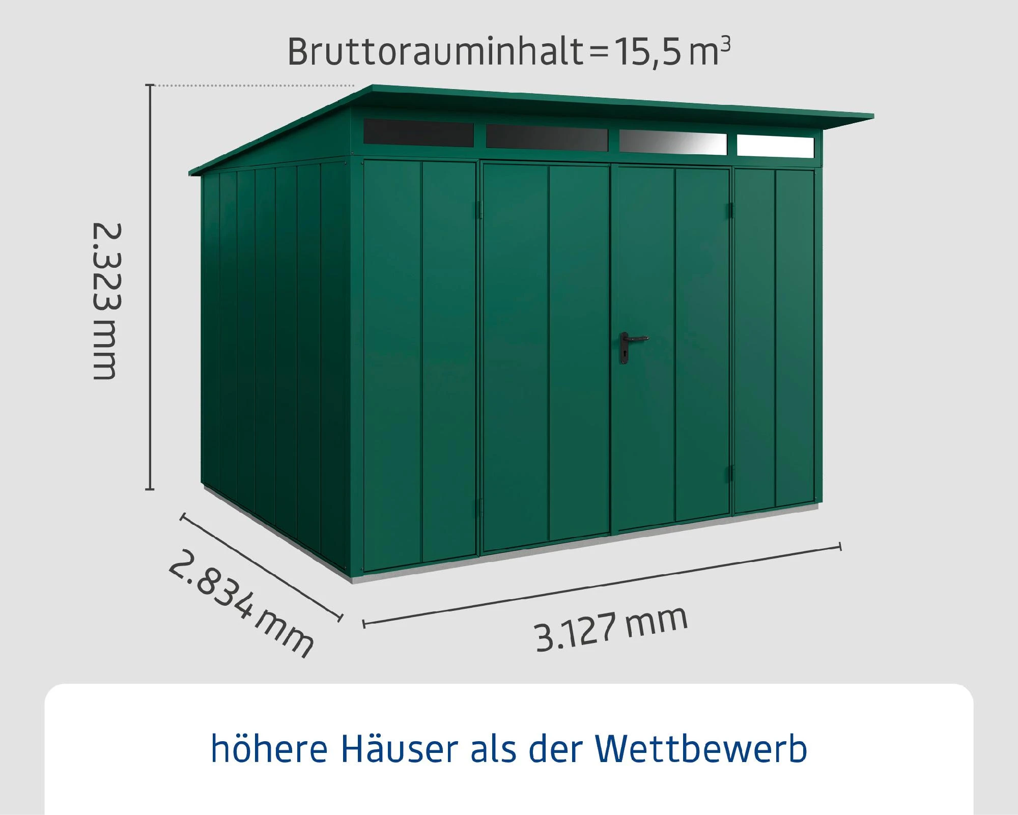 - Außenmaße inkl. Dachvorsprung (BxTxH): 312,7 x 283,4 x 232,3 cm