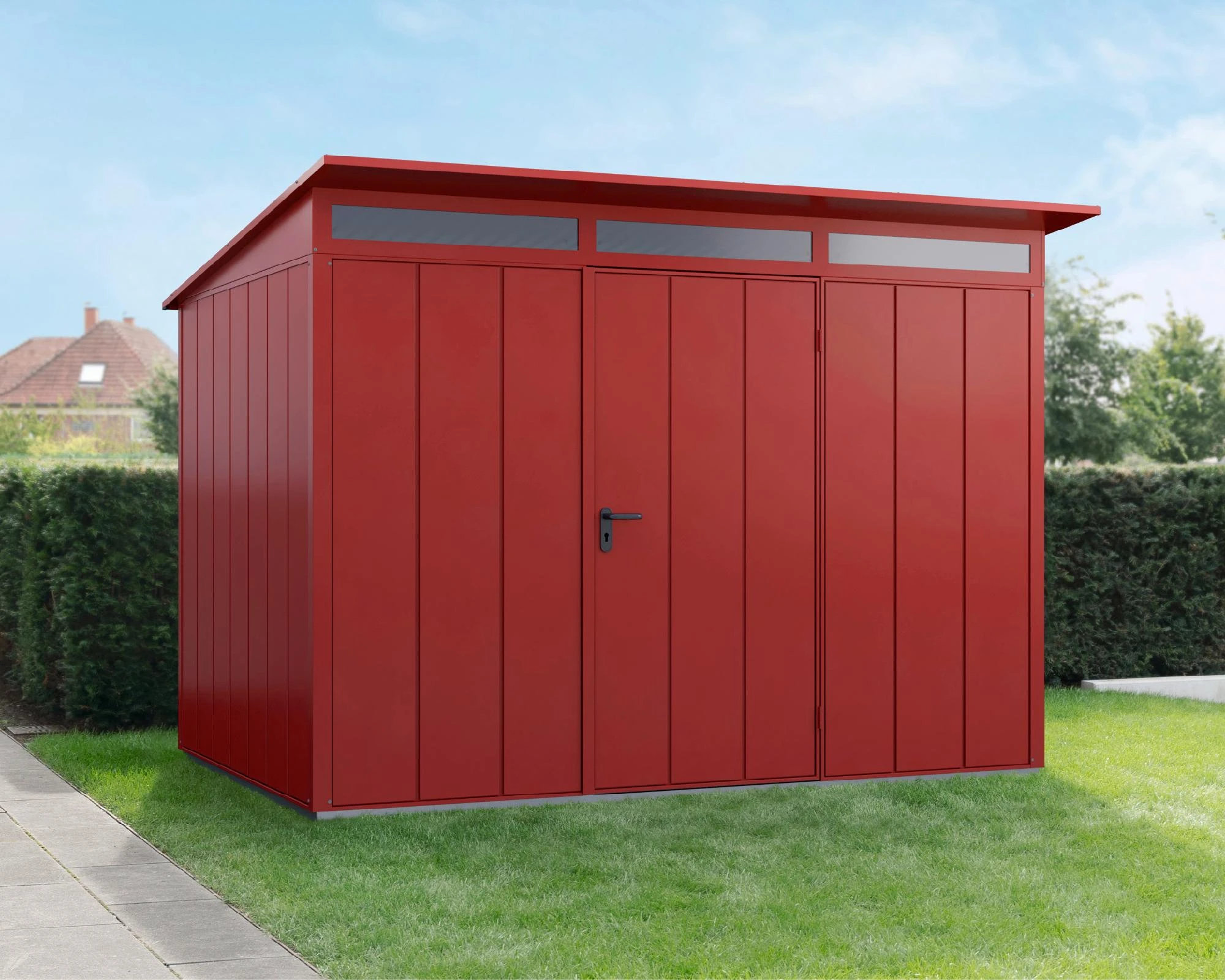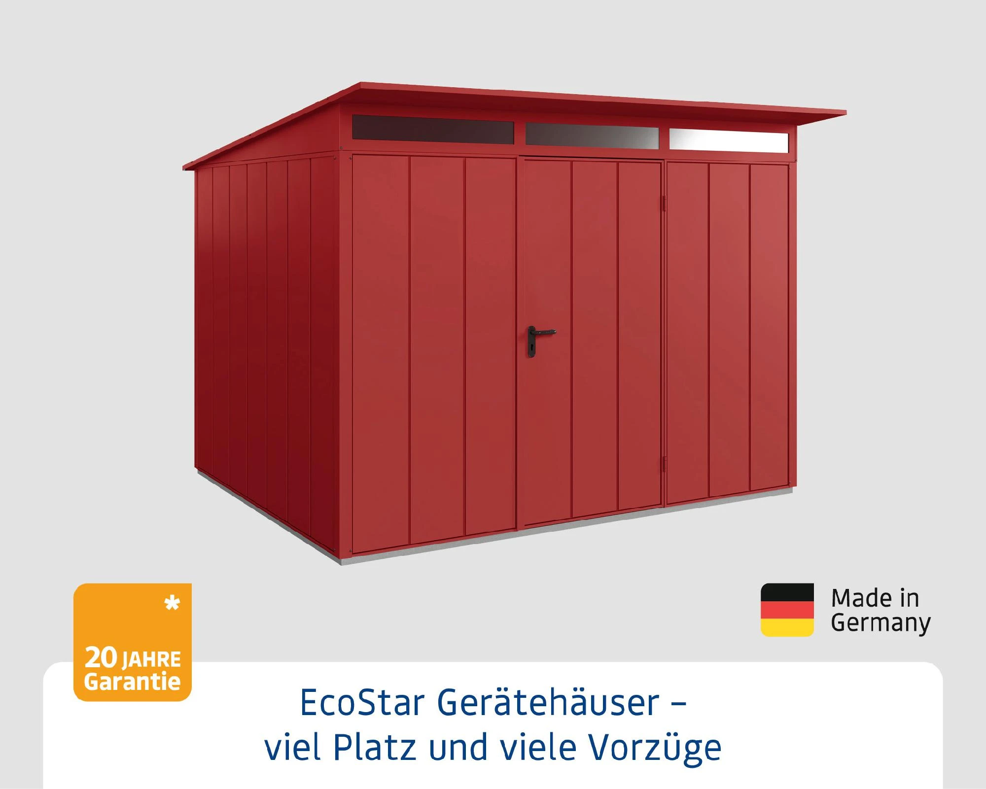 EcoStar Gerätehäuser mit Pultdach sind in zwei unterschiedlichen Motiven und einer Vielzahl von Ausführungen erhältlich. Alle Häuser bieten komfortable Lösungen mit cleverem Stauraum in verschiedenen Größen und Farben. Im Zusammenspiel mit dem funktionalen und praktischen Zubehör findet sich für alles der optimale Platz. Die Häuser werden in einem maximalen Vorfertigungsgrad angeliefert. Der stabilisierende Alu-Bodenrahmen ist bereits im Preis enthalten. Aufbau und Montage gestalten sich damit einfach, schnell und unkompliziert. EcoStar Gerätehäuser ELEGANT Pultdach sorgen mit ihrem breiten Motiv für einen modernen und ansprechenden Look. Langlebige und qualitativ hochwertige Materialien gewährleisten dabei eine sehr gepflegte Optik. Oberlichter sorgen für angenehmes Licht im Inneren und der Dachvorsprung schützt bei Regen. In drei unterschiedlichen Größen bieten diese Gerätehäuser viele Zubehöroptionen und ausreichend Stauraum für alles, was den Garten und die Freizeit lebenswert macht. Von Gartengeräten bis zum Fahrrad – alles ist sicher verstaut, dank zuverlässiger Schlösser und Bänder. Mit den Gerätehäusern von EcoStar schaffen Sie einen schönen Platz für Ordnung in Ihrem Garten