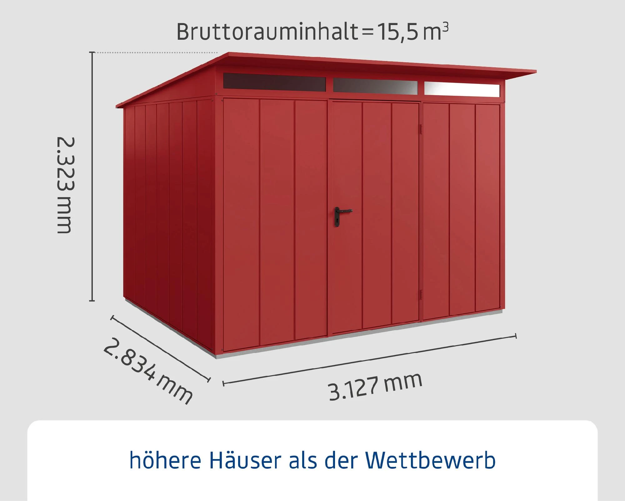 - Außenmaße inkl. Dachvorsprung (BxTxH): 312,7 x 283,4 x 232,3 cm