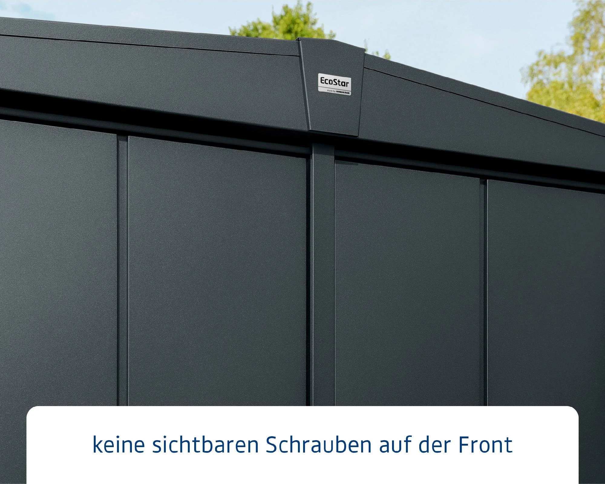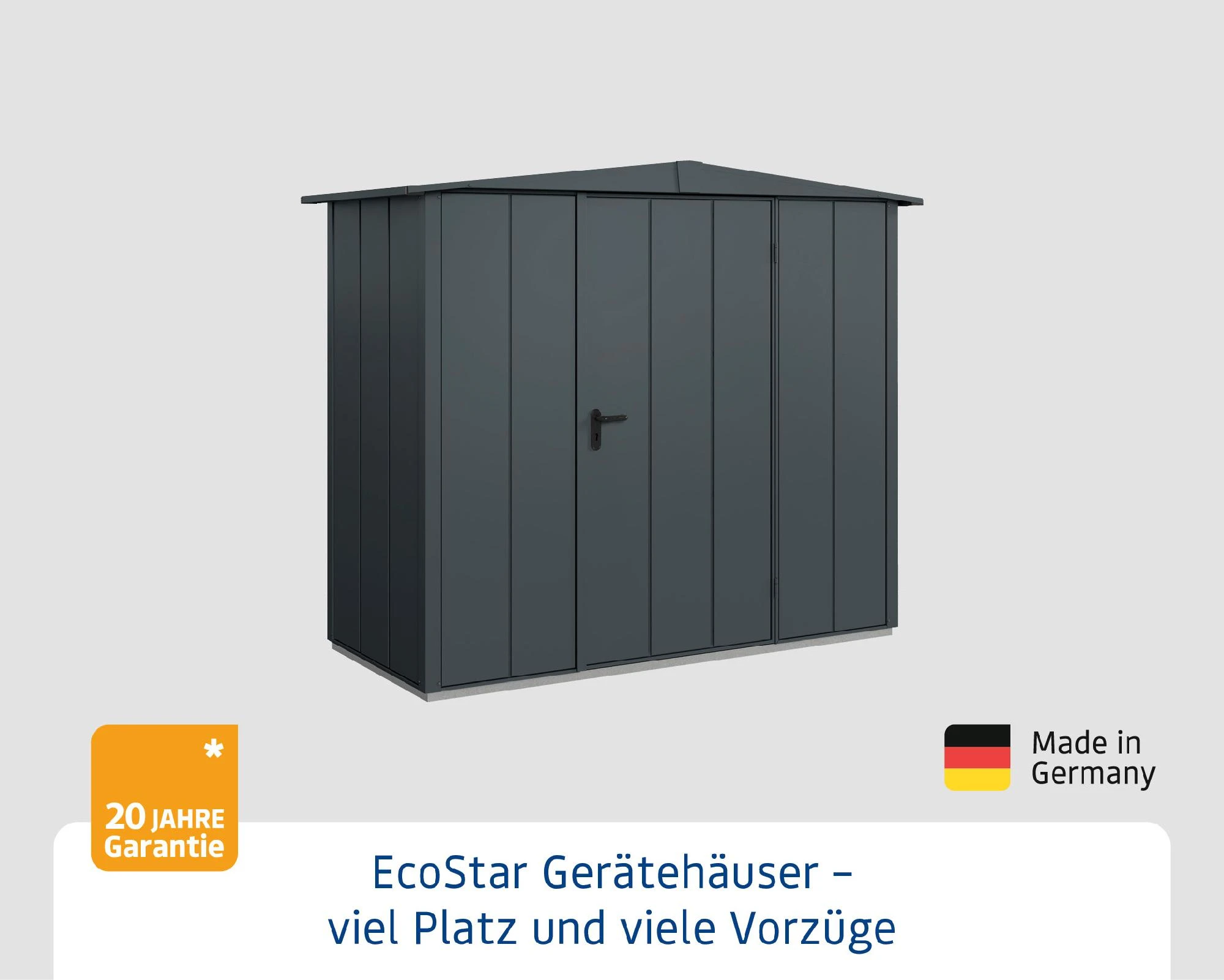 EcoStar Gerätehäuser mit Satteldach sind in zwei unterschiedlichen Motiven und einer Vielzahl von Ausführungen erhältlich. Alle Häuser bieten komfortable Lösungen mit cleverem Stauraum in verschiedenen Größen und Farben. Im Zusammenspiel mit dem funktionalen und praktischen Zubehör findet sich für alles der optimale Platz. Die Häuser werden in einem maximalen Vorfertigungsgrad angeliefert. Der stabilisierende Alu-Bodenrahmen ist bereits im Preis enthalten. Aufbau und Montage gestalten sich damit einfach, schnell und unkompliziert. EcoStar Gerätehäuser ELEGANT Satteldach sorgen mit ihrem breiten Motiv für einen modernen und ansprechenden Look. Langlebige und qualitativ hochwertige Materialien gewährleisten dabei eine sehr gepflegte Optik. In drei unterschiedlichen Größen bieten diese Gerätehäuser viele Zubehöroptionen und ausreichend Stauraum für alles, was den Garten und die Freizeit lebenswert macht. Von Gartengeräten bis zum Fahrrad – alles ist sicher verstaut, dank zuverlässiger Schlösser und Bänder. Mit den Gerätehäusern von EcoStar schaffen Sie einen schönen Platz für Ordnung in Ihrem Garten.