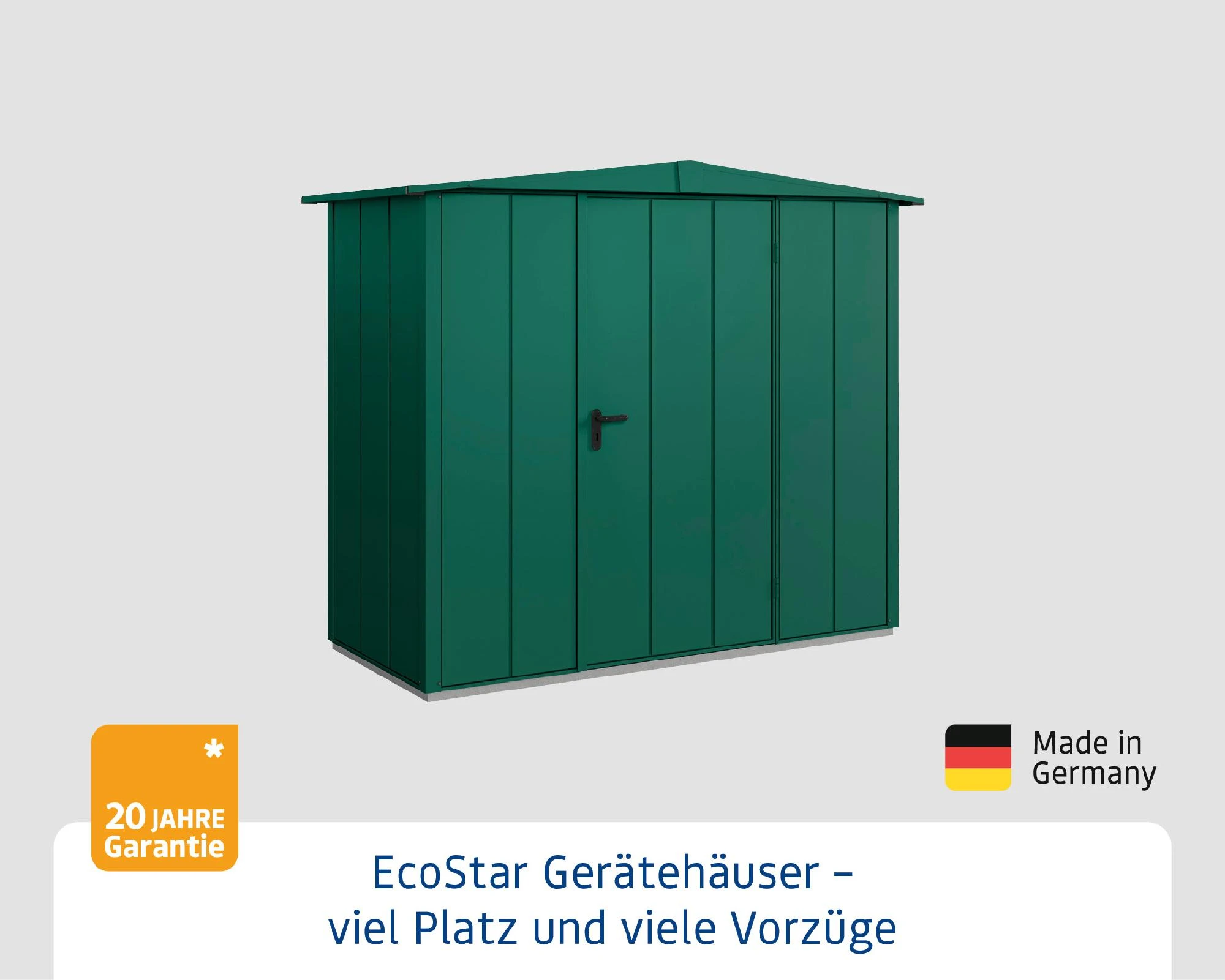 EcoStar Gerätehäuser mit Satteldach sind in zwei unterschiedlichen Motiven und einer Vielzahl von Ausführungen erhältlich. Alle Häuser bieten komfortable Lösungen mit cleverem Stauraum in verschiedenen Größen und Farben. Im Zusammenspiel mit dem funktionalen und praktischen Zubehör findet sich für alles der optimale Platz. Die Häuser werden in einem maximalen Vorfertigungsgrad angeliefert. Der stabilisierende Alu-Bodenrahmen ist bereits im Preis enthalten. Aufbau und Montage gestalten sich damit einfach, schnell und unkompliziert. EcoStar Gerätehäuser ELEGANT Satteldach sorgen mit ihrem breiten Motiv für einen modernen und ansprechenden Look. Langlebige und qualitativ hochwertige Materialien gewährleisten dabei eine sehr gepflegte Optik. In drei unterschiedlichen Größen bieten diese Gerätehäuser viele Zubehöroptionen und ausreichend Stauraum für alles, was den Garten und die Freizeit lebenswert macht. Von Gartengeräten bis zum Fahrrad – alles ist sicher verstaut, dank zuverlässiger Schlösser und Bänder. Mit den Gerätehäusern von EcoStar schaffen Sie einen schönen Platz für Ordnung in Ihrem Garten.