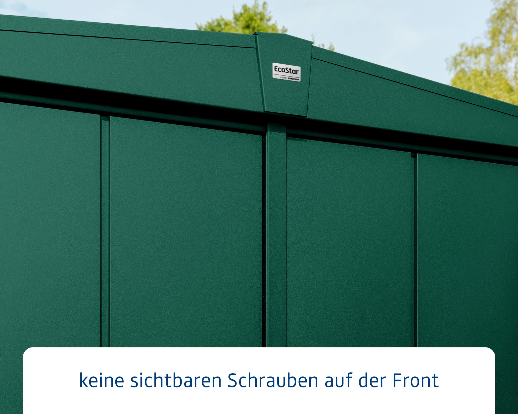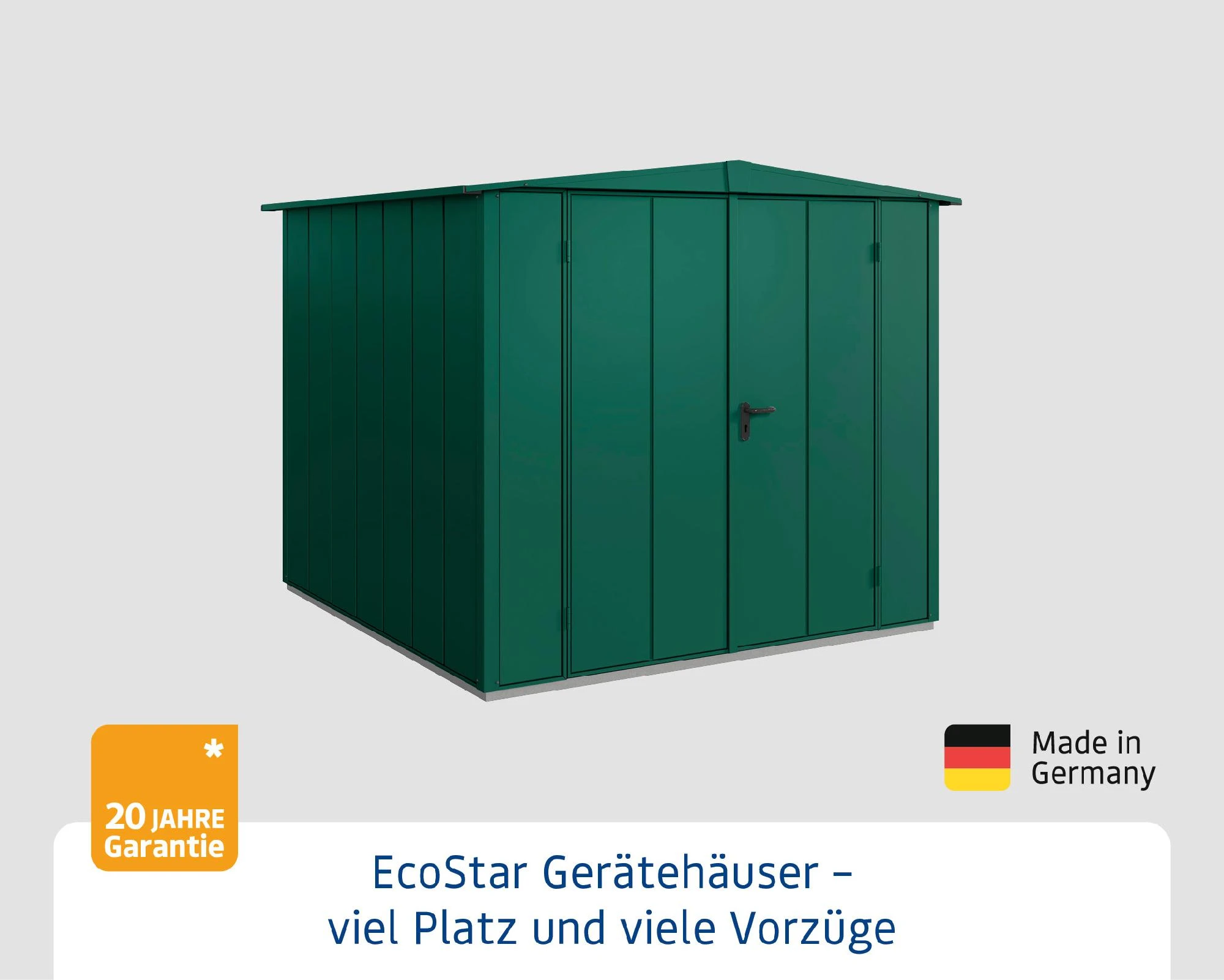 EcoStar Gerätehäuser mit Satteldach sind in zwei unterschiedlichen Motiven und einer Vielzahl von Ausführungen erhältlich. Alle Häuser bieten komfortable Lösungen mit cleverem Stauraum in verschiedenen Größen und Farben. Im Zusammenspiel mit dem funktionalen und praktischen Zubehör findet sich für alles der optimale Platz. Die Häuser werden in einem maximalen Vorfertigungsgrad angeliefert. Der stabilisierende Alu-Bodenrahmen ist bereits im Preis enthalten. Aufbau und Montage gestalten sich damit einfach, schnell und unkompliziert. EcoStar Gerätehäuser ELEGANT Satteldach sorgen mit ihrem breiten Motiv für einen modernen und ansprechenden Look. Langlebige und qualitativ hochwertige Materialien gewährleisten dabei eine sehr gepflegte Optik. In drei unterschiedlichen Größen bieten diese Gerätehäuser viele Zubehöroptionen und ausreichend Stauraum für alles, was den Garten und die Freizeit lebenswert macht. Von Gartengeräten bis zum Fahrrad – alles ist sicher verstaut, dank zuverlässiger Schlösser und Bänder. Mit den Gerätehäusern von EcoStar schaffen Sie einen schönen Platz für Ordnung in Ihrem Garten.