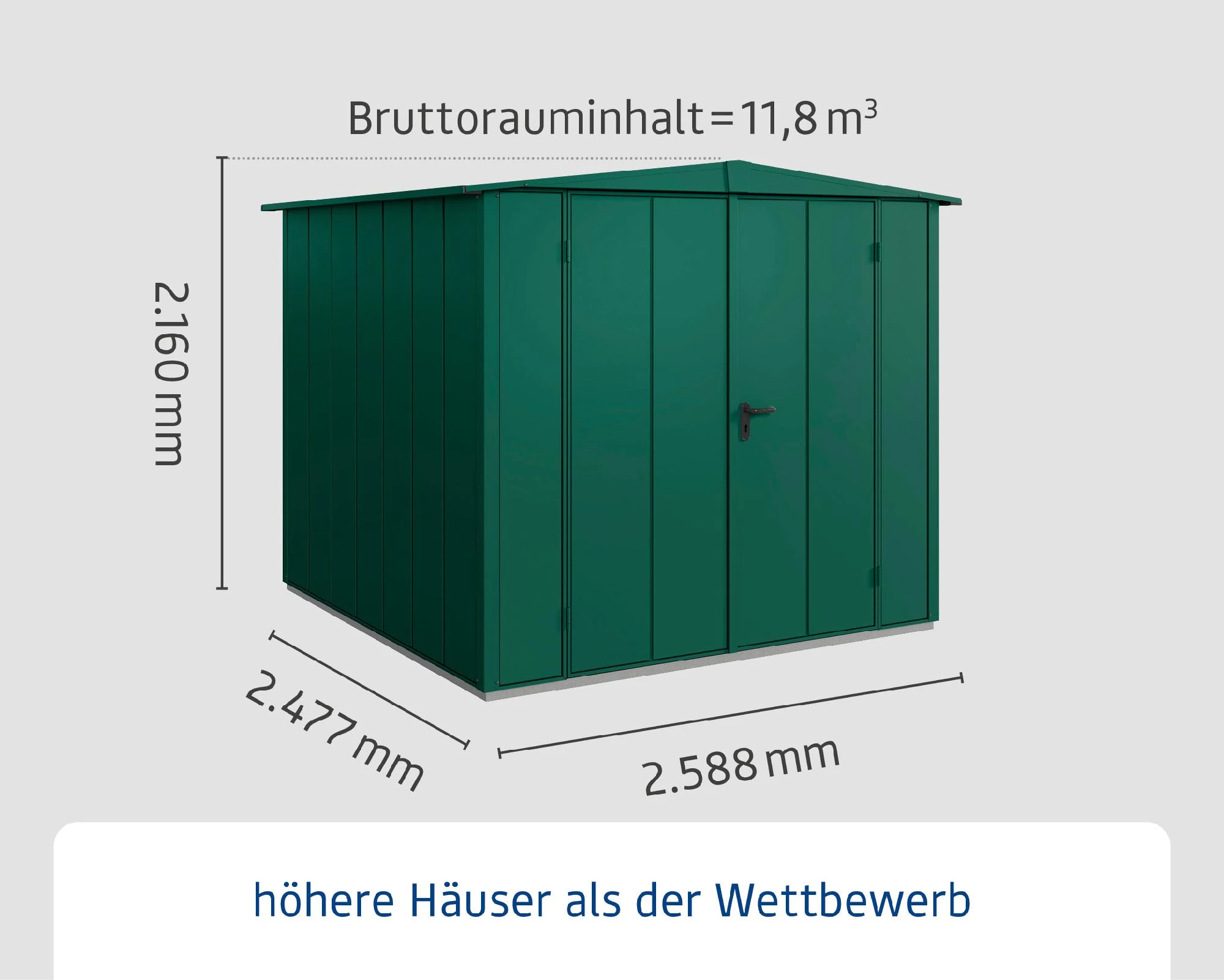 - Außenmaße inkl. Dachvorsprung (BxTxH): 258,8 x 247,7 x 216 cm