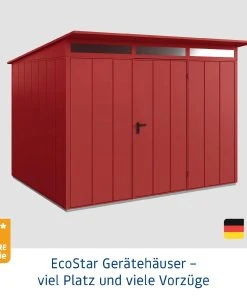EcoStar Gerätehäuser mit Pultdach sind in zwei unterschiedlichen Motiven und einer Vielzahl von Ausführungen erhältlich. Alle Häuser bieten komfortable Lösungen mit cleverem Stauraum in verschiedenen Größen und Farben. Im Zusammenspiel mit dem funktionalen und praktischen Zubehör findet sich für alles der optimale Platz. Die Häuser werden in einem maximalen Vorfertigungsgrad angeliefert. Der stabilisierende Alu-Bodenrahmen ist bereits im Preis enthalten. Aufbau und Montage gestalten sich damit einfach, schnell und unkompliziert.EcoStar Gerätehäuser TREND Pultdach bestechen mit schmalen, senkrechten Lamellen. Die sehr gleichmäßige, aufgeräumte Optik lässt sich hervorragend zu Fassaden, Haustüren und Garagenschwingtoren kombinieren. Oberlichter sorgen für angenehmes Licht im Inneren und der Dachvorsprung schützt bei Regen. Im Inneren findet sich ausreichend Platz für Gartengeräte, Werkzeuge oder Spielzeuge und dank der zuverlässigen Schlösser und Bänder auch für E-Bikes und Gartenmöbel. Mit den Gerätehäusern von EcoStar ziehen Stauraum und Ordnung in Ihren Garten.