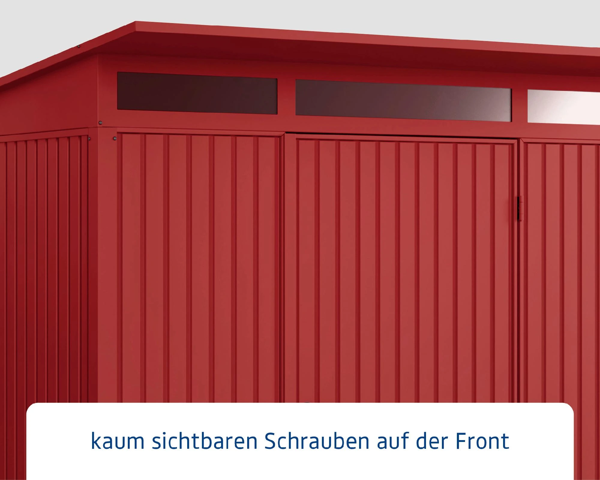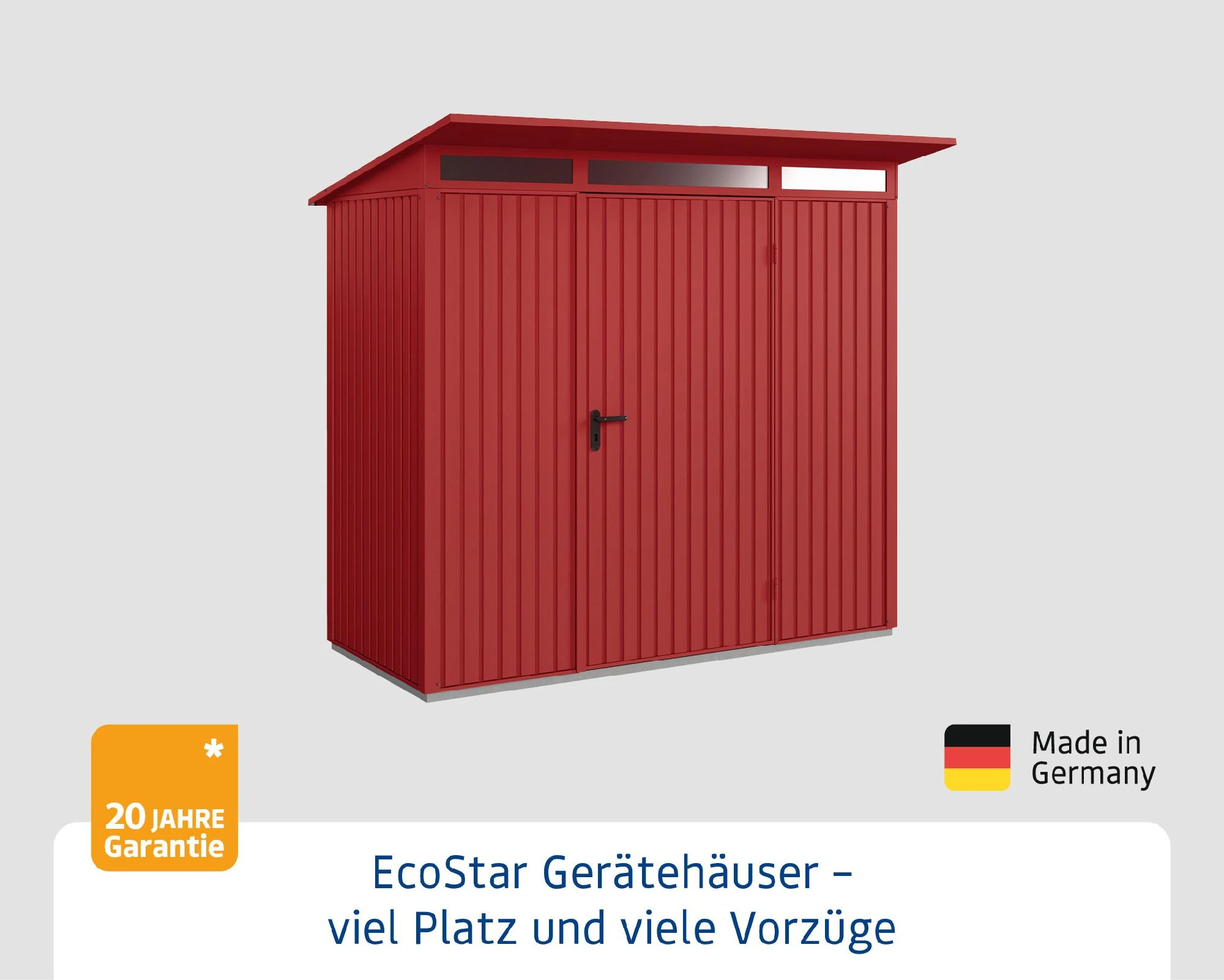 EcoStar Gerätehäuser mit Pultdach sind in zwei unterschiedlichen Motiven und einer Vielzahl von Ausführungen erhältlich. Alle Häuser bieten komfortable Lösungen mit cleverem Stauraum in verschiedenen Größen und Farben. Im Zusammenspiel mit dem funktionalen und praktischen Zubehör findet sich für alles der optimale Platz. Die Häuser werden in einem maximalen Vorfertigungsgrad angeliefert. Der stabilisierende Alu-Bodenrahmen ist bereits im Preis enthalten. Aufbau und Montage gestalten sich damit einfach, schnell und unkompliziert.EcoStar Gerätehäuser TREND Pultdach bestechen mit schmalen, senkrechten Lamellen. Die sehr gleichmäßige, aufgeräumte Optik lässt sich hervorragend zu Fassaden, Haustüren und Garagenschwingtoren kombinieren. Oberlichter sorgen für angenehmes Licht im Inneren und der Dachvorsprung schützt bei Regen. Im Inneren findet sich ausreichend Platz für Gartengeräte, Werkzeuge oder Spielzeuge und dank der zuverlässigen Schlösser und Bänder auch für E-Bikes und Gartenmöbel. Mit den Gerätehäusern von EcoStar ziehen Stauraum und Ordnung in Ihren Garten.