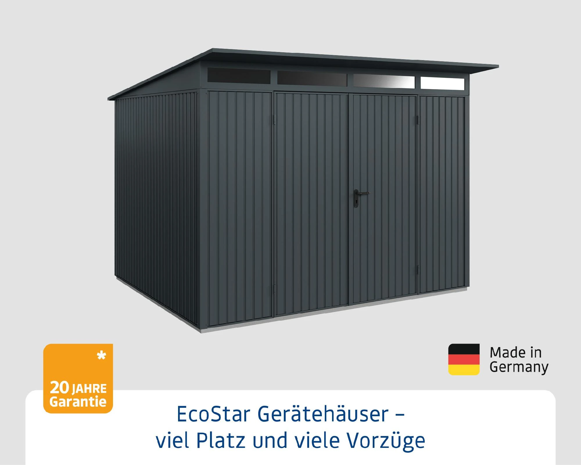 EcoStar Gerätehäuser mit Pultdach sind in zwei unterschiedlichen Motiven und einer Vielzahl von Ausführungen erhältlich. Alle Häuser bieten komfortable Lösungen mit cleverem Stauraum in verschiedenen Größen und Farben. Im Zusammenspiel mit dem funktionalen und praktischen Zubehör findet sich für alles der optimale Platz. Die Häuser werden in einem maximalen Vorfertigungsgrad angeliefert. Der stabilisierende Alu-Bodenrahmen ist bereits im Preis enthalten. Aufbau und Montage gestalten sich damit einfach, schnell und unkompliziert.EcoStar Gerätehäuser TREND Pultdach bestechen mit schmalen, senkrechten Lamellen. Die sehr gleichmäßige, aufgeräumte Optik lässt sich hervorragend zu Fassaden, Haustüren und Garagenschwingtoren kombinieren. Oberlichter sorgen für angenehmes Licht im Inneren und der Dachvorsprung schützt bei Regen. Im Inneren findet sich ausreichend Platz für Gartengeräte, Werkzeuge oder Spielzeuge und dank der zuverlässigen Schlösser und Bänder auch für E-Bikes und Gartenmöbel. Mit den Gerätehäusern von EcoStar ziehen Stauraum und Ordnung in Ihren Garten.