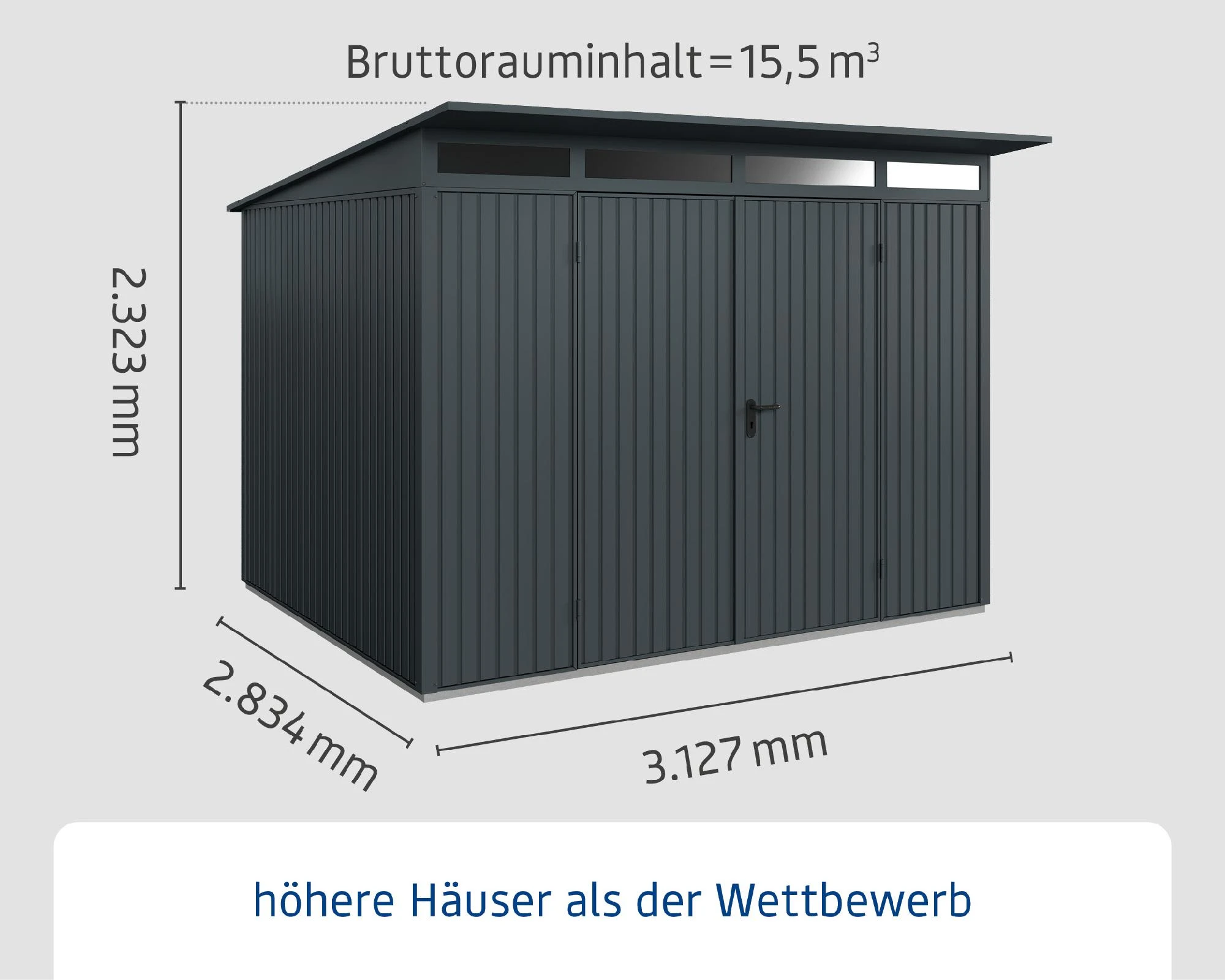 - Außenmaße inkl. Dachvorsprung (BxTxH): 312,7 x 283,4 x 232,3 cm