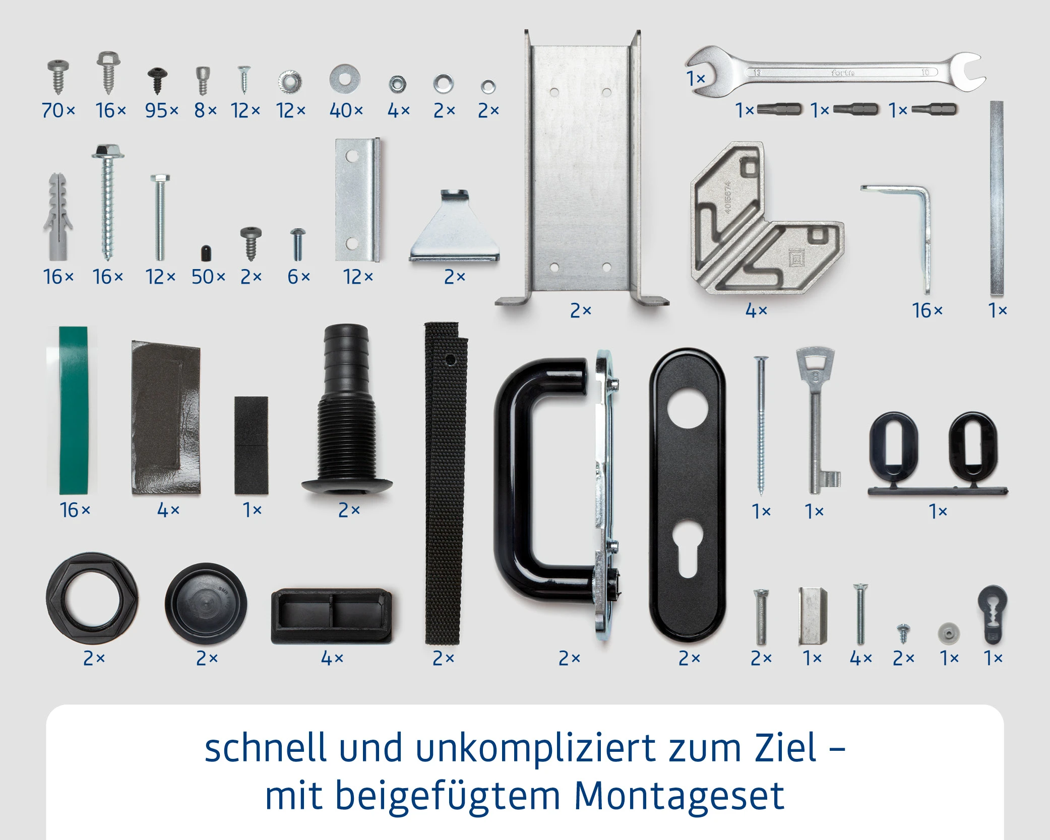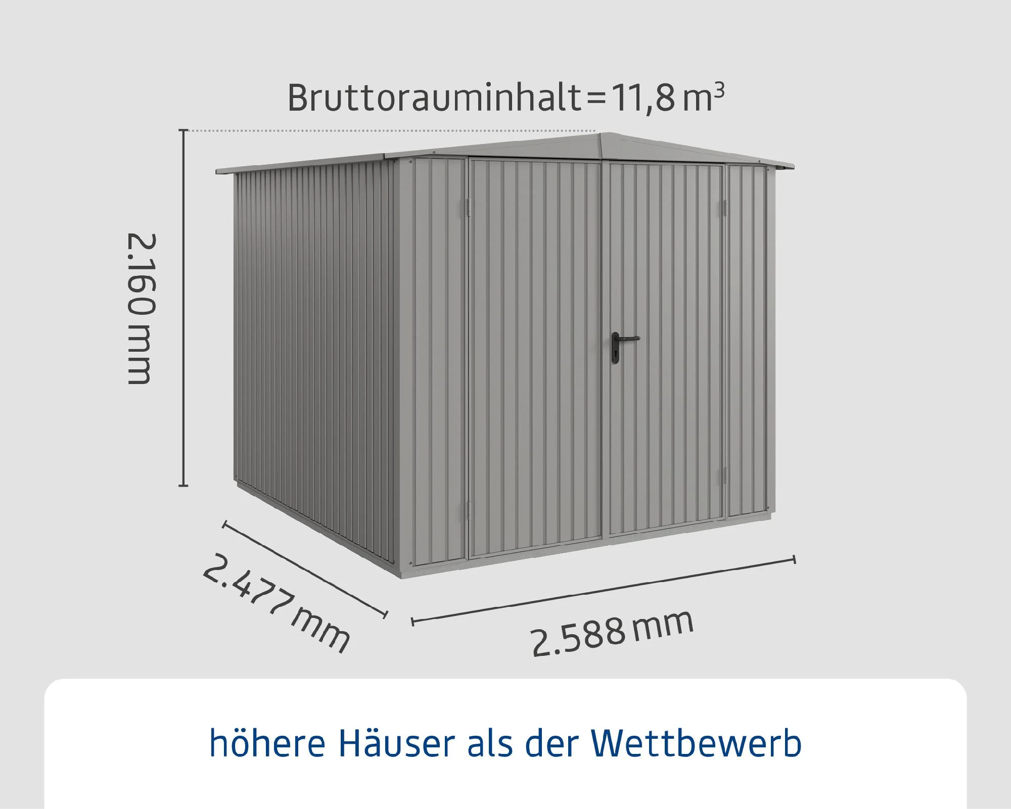 - Außenmaße inkl. Dachvorsprung (BxTxH): 258,8 x 247,7 x 216 cm
