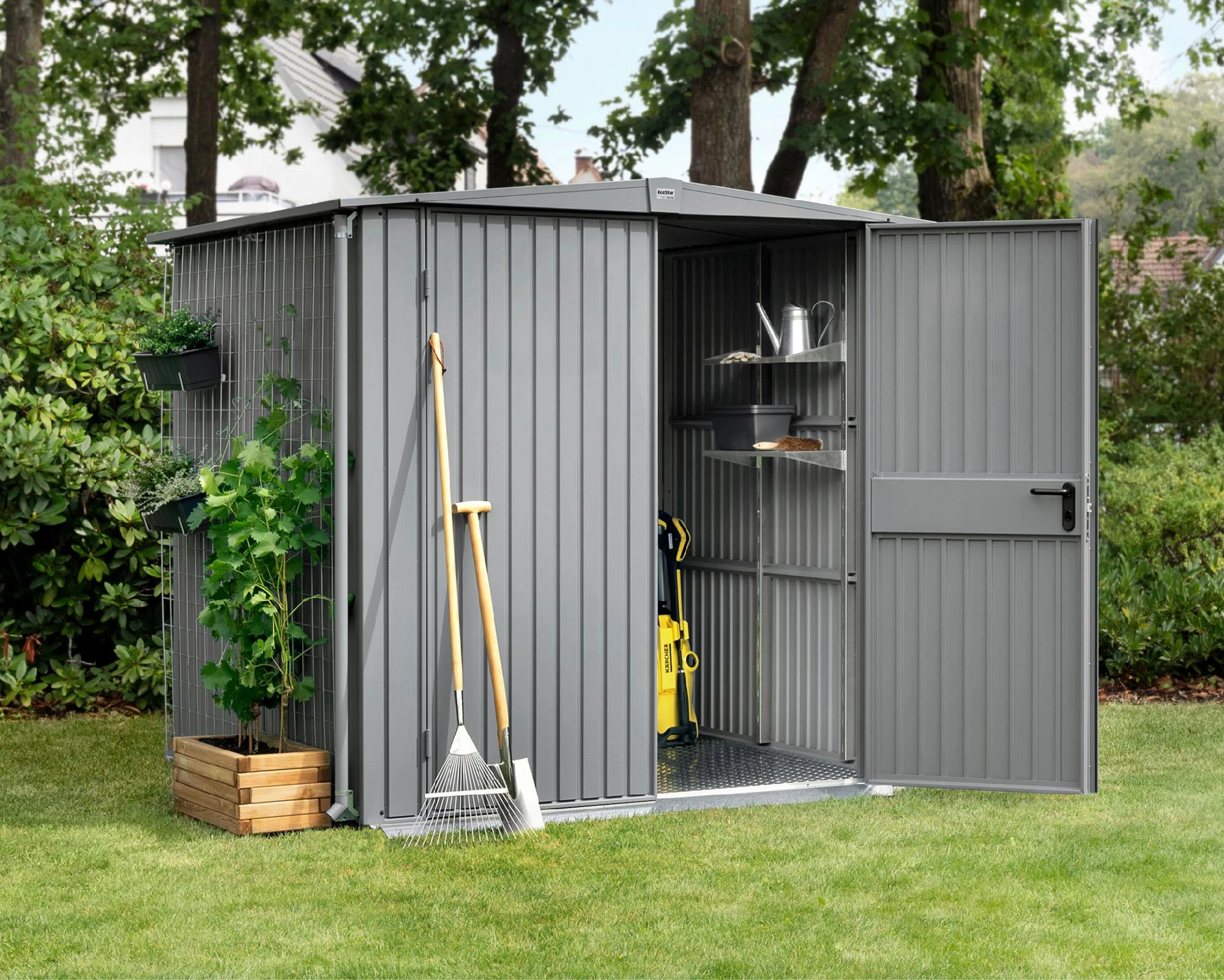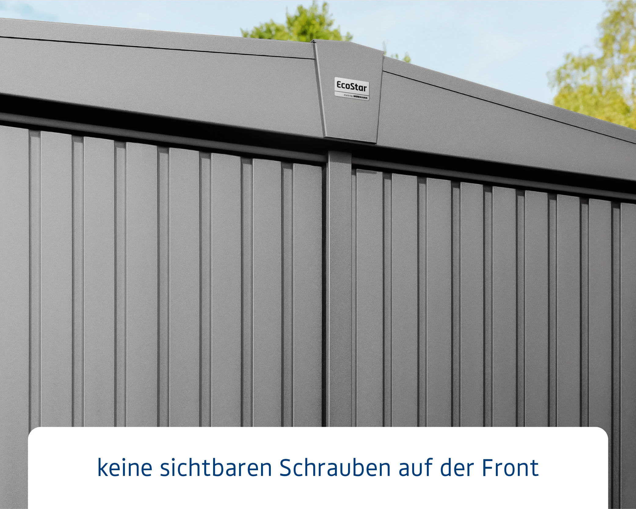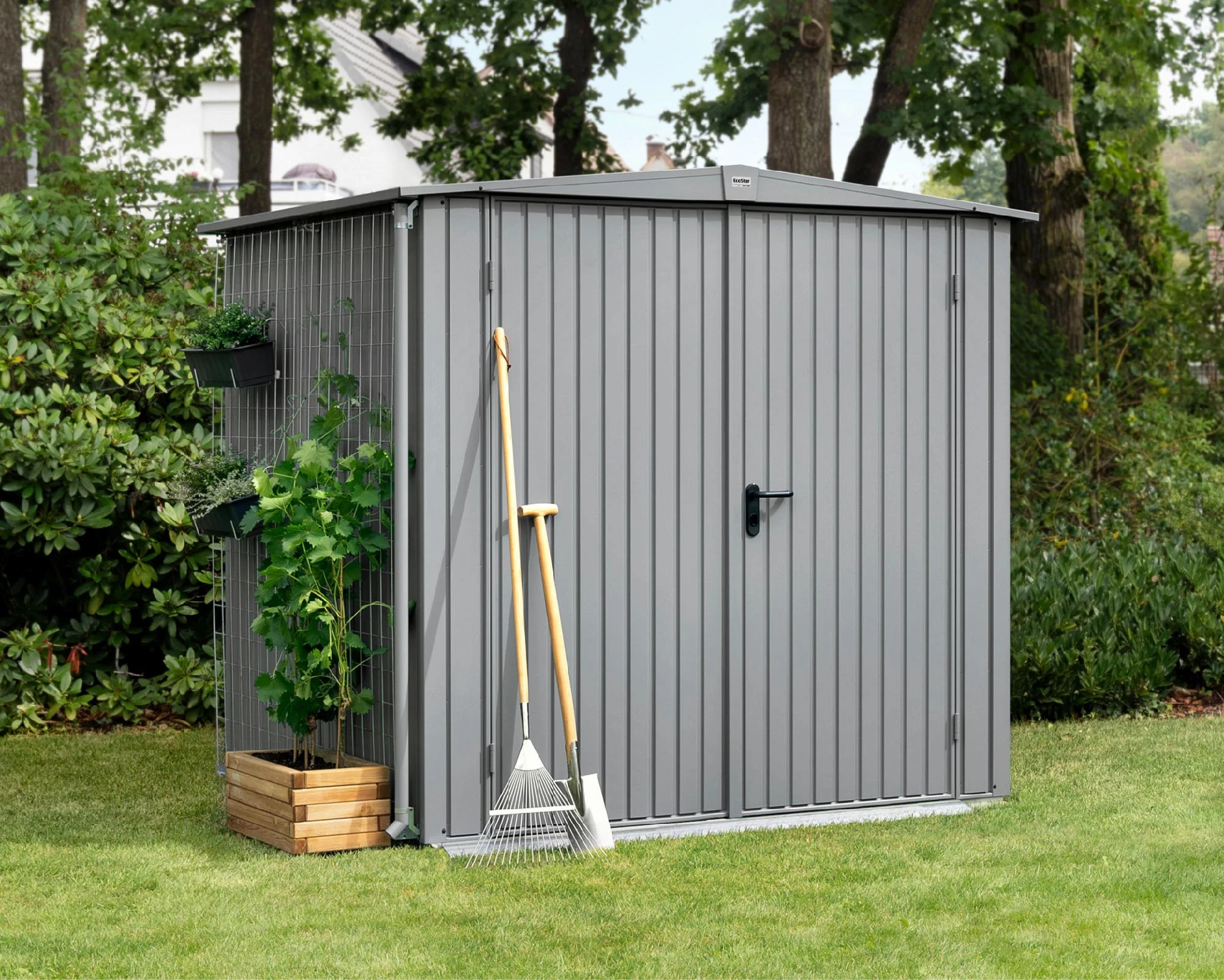 EcoStar Gerätehäuser mit Satteldach sind in zwei unterschiedlichen Motiven und einer Vielzahl von Ausführungen erhältlich. Alle Häuser bieten komfortable Lösungen mit cleverem Stauraum in verschiedenen Größen und Farben. Im Zusammenspiel mit dem funktionalen und praktischen Zubehör findet sich für alles der optimale Platz. Die Häuser werden in einem maximalen Vorfertigungsgrad angeliefert. Der stabilisierende Alu-Bodenrahmen ist bereits im Preis enthalten. Aufbau und Montage gestalten sich damit einfach, schnell und unkompliziert. EcoStar Gerätehäuser TREND Satteldach bestechen mit schmalen, senkrechten Lamellen. Die sehr gleichmäßige, aufgeräumte Optik lässt sich hervorragend zu Fassaden, Haustüren und Garagenschwingtoren kombinieren. Im Inneren findet sich ausreichend Platz für Gartengeräte, Werkzeuge oder Spielzeuge und dank der zuverlässigen Schlösser und Bänder auch für E-Bikes und Gartenmöbel. Mit den Gerätehäusern von EcoStar ziehen Stauraum und Ordnung in Ihren Garten.