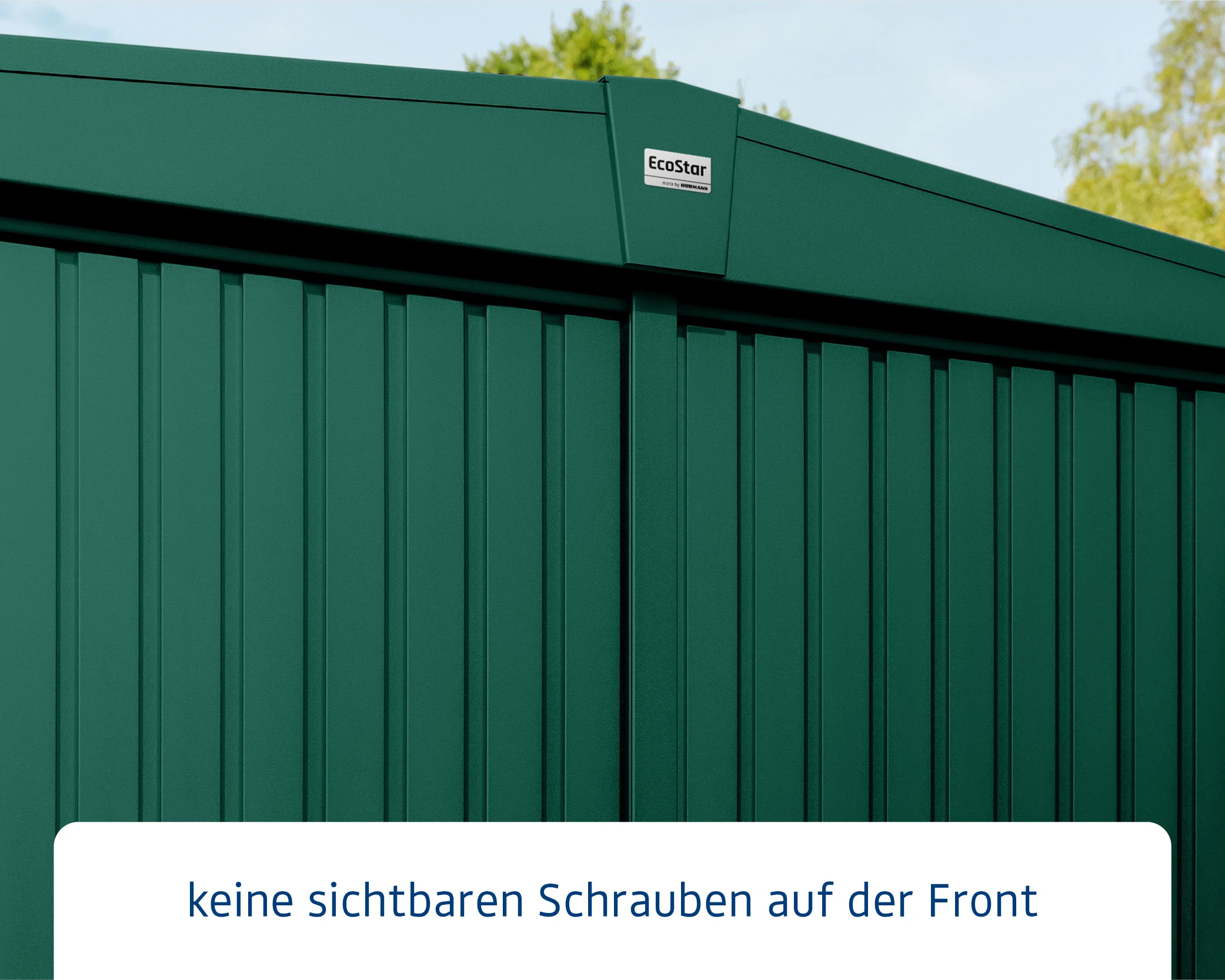 EcoStar Gerätehäuser mit Satteldach sind in zwei unterschiedlichen Motiven und einer Vielzahl von Ausführungen erhältlich. Alle Häuser bieten komfortable Lösungen mit cleverem Stauraum in verschiedenen Größen und Farben. Im Zusammenspiel mit dem funktionalen und praktischen Zubehör findet sich für alles der optimale Platz. Die Häuser werden in einem maximalen Vorfertigungsgrad angeliefert. Der stabilisierende Alu-Bodenrahmen ist bereits im Preis enthalten. Aufbau und Montage gestalten sich damit einfach, schnell und unkompliziert. EcoStar Gerätehäuser TREND Satteldach bestechen mit schmalen, senkrechten Lamellen. Die sehr gleichmäßige, aufgeräumte Optik lässt sich hervorragend zu Fassaden, Haustüren und Garagenschwingtoren kombinieren. Im Inneren findet sich ausreichend Platz für Gartengeräte, Werkzeuge oder Spielzeuge und dank der zuverlässigen Schlösser und Bänder auch für E-Bikes und Gartenmöbel. Mit den Gerätehäusern von EcoStar ziehen Stauraum und Ordnung in Ihren Garten.
