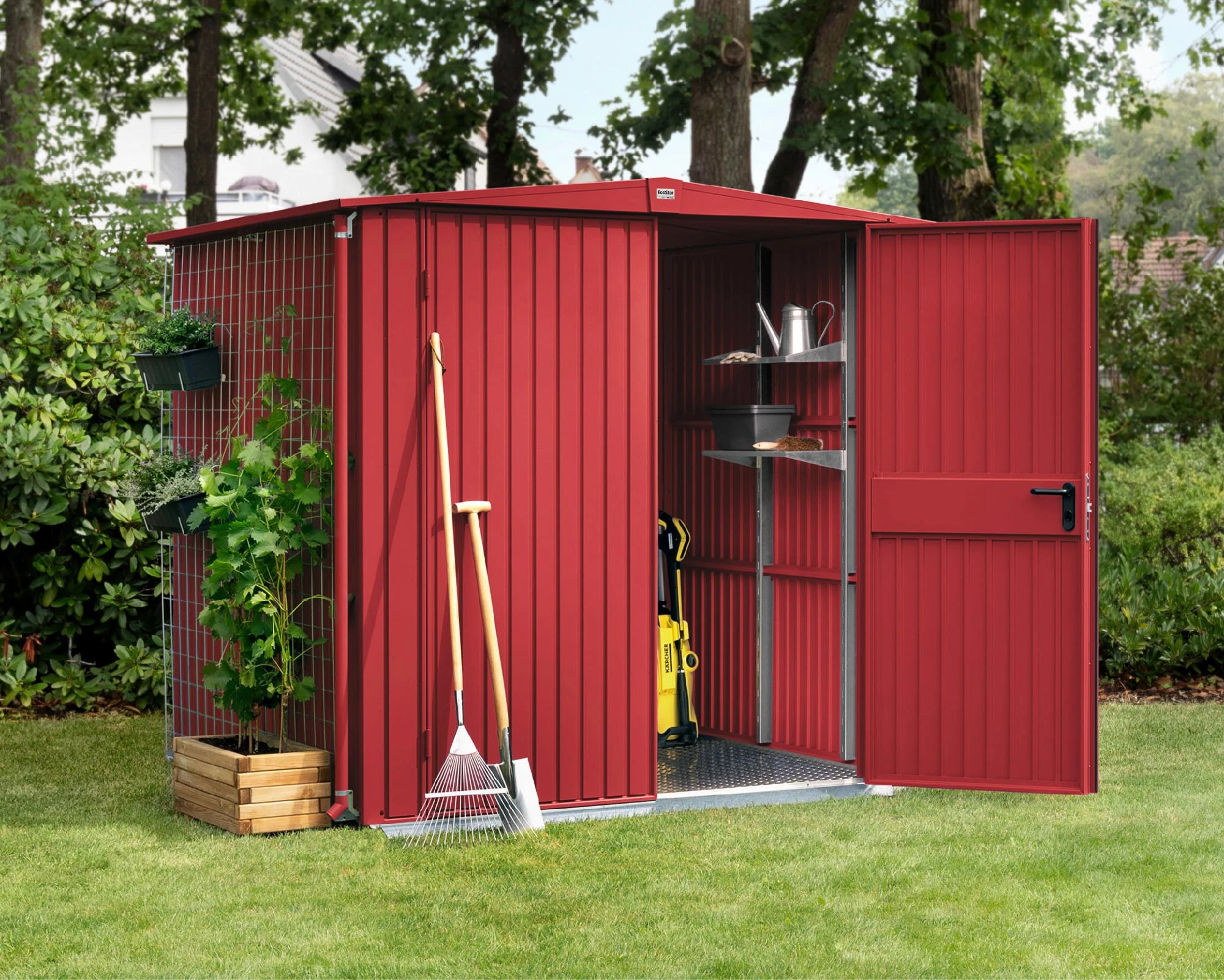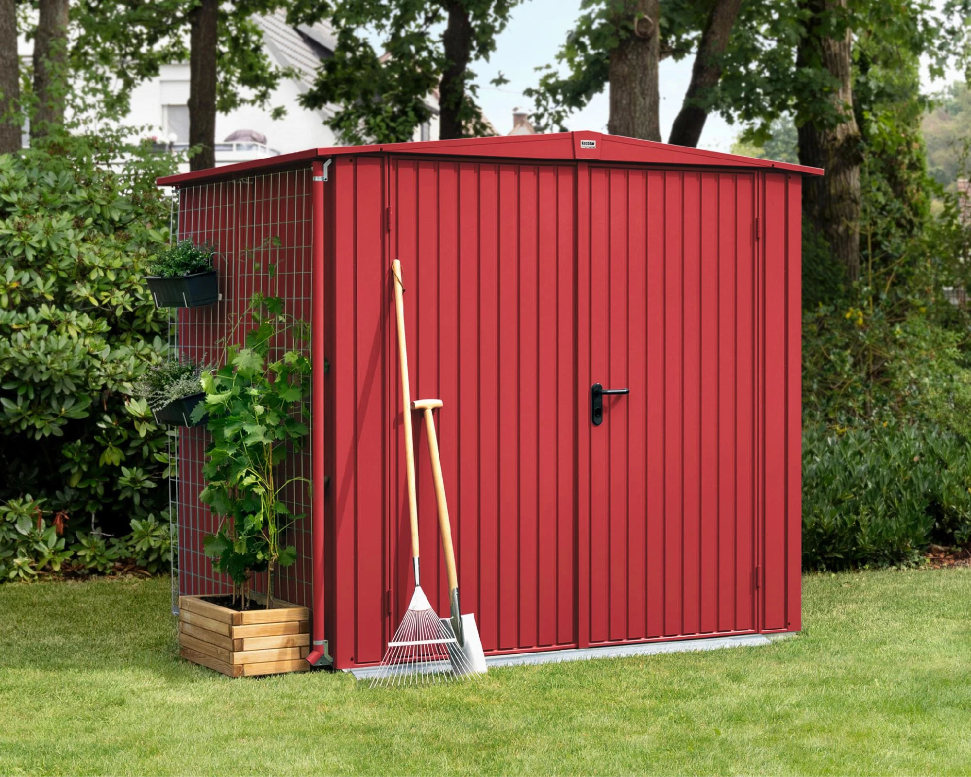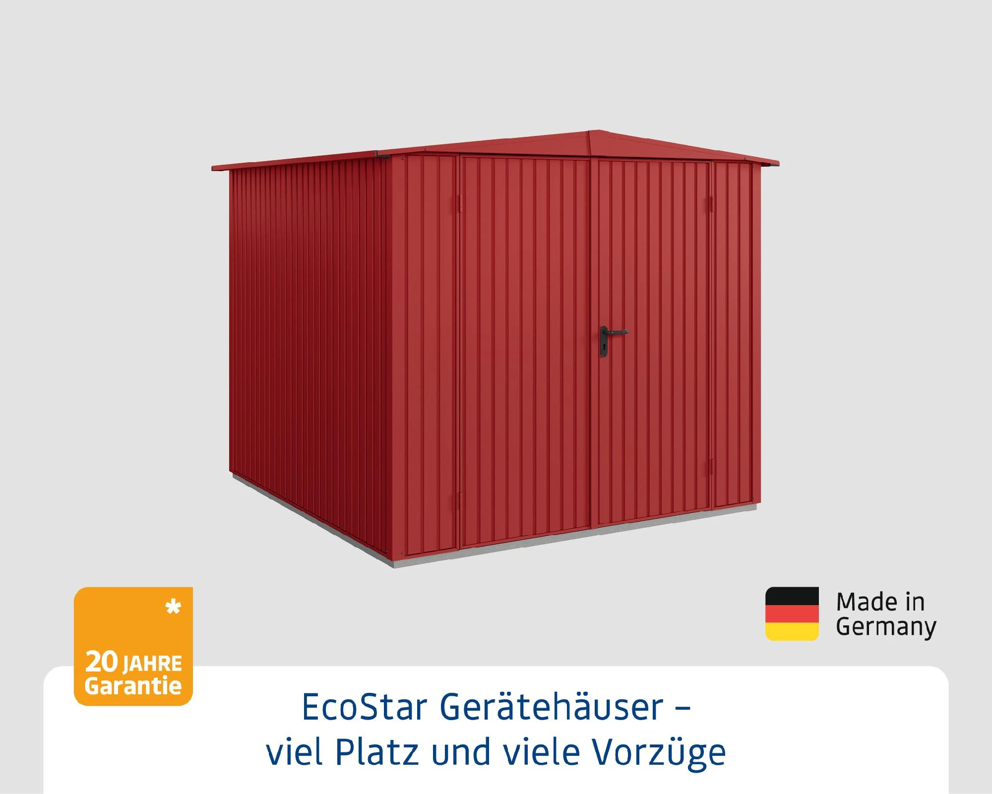EcoStar Gerätehäuser mit Satteldach sind in zwei unterschiedlichen Motiven und einer Vielzahl von Ausführungen erhältlich. Alle Häuser bieten komfortable Lösungen mit cleverem Stauraum in verschiedenen Größen und Farben. Im Zusammenspiel mit dem funktionalen und praktischen Zubehör findet sich für alles der optimale Platz. Die Häuser werden in einem maximalen Vorfertigungsgrad angeliefert. Der stabilisierende Alu-Bodenrahmen ist bereits im Preis enthalten. Aufbau und Montage gestalten sich damit einfach, schnell und unkompliziert. EcoStar Gerätehäuser TREND Satteldach bestechen mit schmalen, senkrechten Lamellen. Die sehr gleichmäßige, aufgeräumte Optik lässt sich hervorragend zu Fassaden, Haustüren und Garagenschwingtoren kombinieren. Im Inneren findet sich ausreichend Platz für Gartengeräte, Werkzeuge oder Spielzeuge und dank der zuverlässigen Schlösser und Bänder auch für E-Bikes und Gartenmöbel. Mit den Gerätehäusern von EcoStar ziehen Stauraum und Ordnung in Ihren Garten.