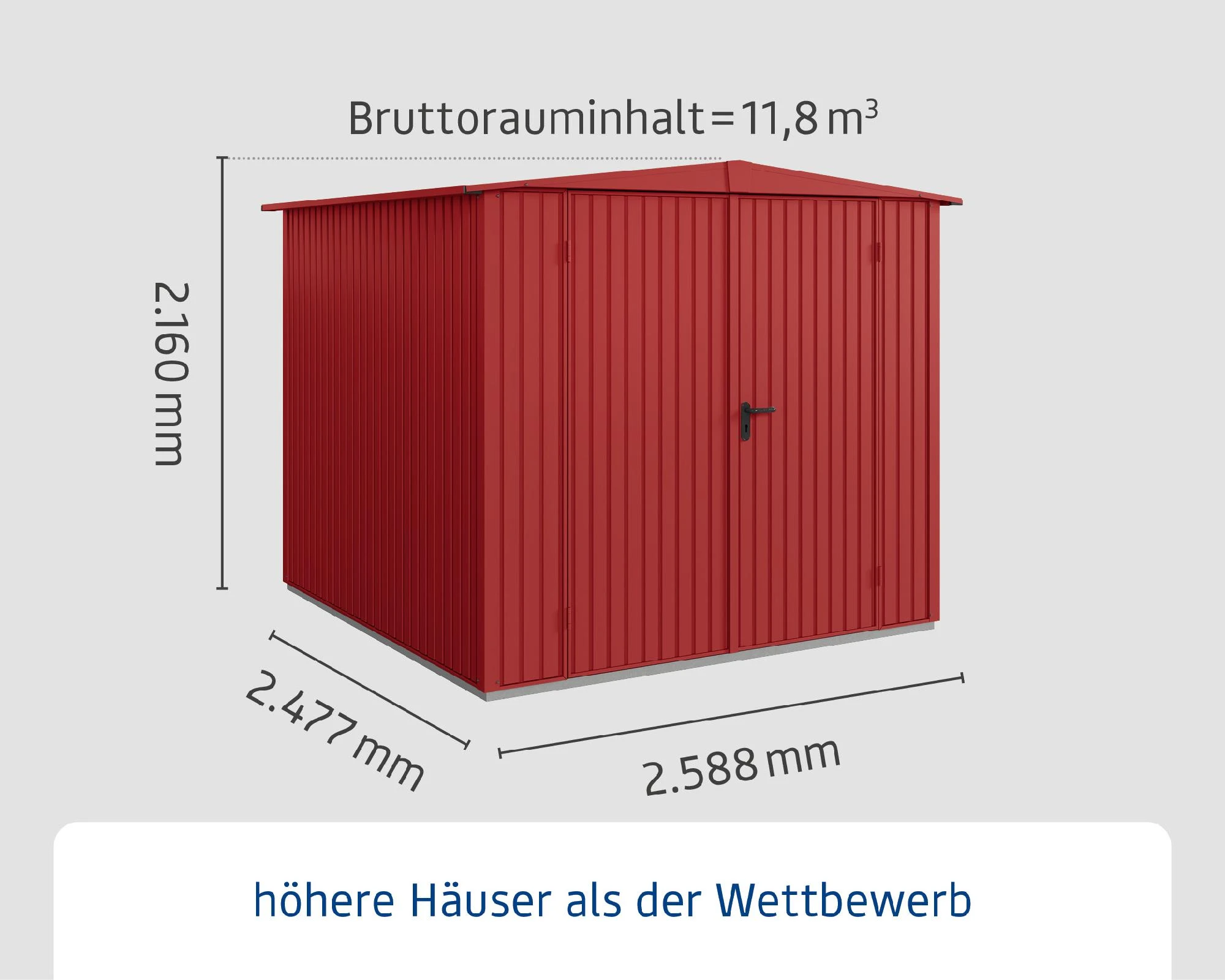 - Außenmaße inkl. Dachvorsprung (BxTxH): 258,8 x 247,7 x 216 cm