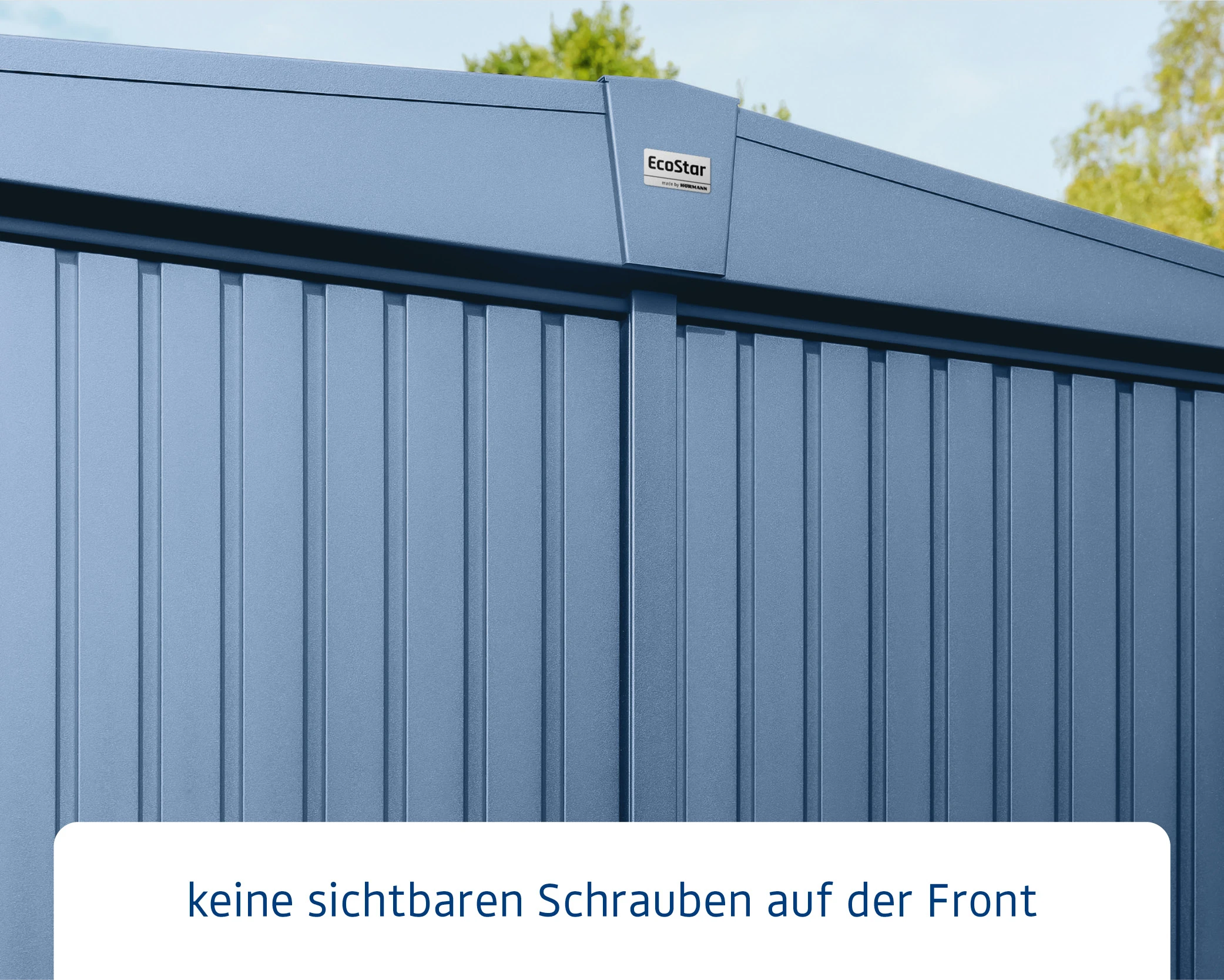 EcoStar Gerätehäuser mit Satteldach sind in zwei unterschiedlichen Motiven und einer Vielzahl von Ausführungen erhältlich. Alle Häuser bieten komfortable Lösungen mit cleverem Stauraum in verschiedenen Größen und Farben. Im Zusammenspiel mit dem funktionalen und praktischen Zubehör findet sich für alles der optimale Platz. Die Häuser werden in einem maximalen Vorfertigungsgrad angeliefert. Der stabilisierende Alu-Bodenrahmen ist bereits im Preis enthalten. Aufbau und Montage gestalten sich damit einfach, schnell und unkompliziert. EcoStar Gerätehäuser TREND Satteldach bestechen mit schmalen, senkrechten Lamellen. Die sehr gleichmäßige, aufgeräumte Optik lässt sich hervorragend zu Fassaden, Haustüren und Garagenschwingtoren kombinieren. Im Inneren findet sich ausreichend Platz für Gartengeräte, Werkzeuge oder Spielzeuge und dank der zuverlässigen Schlösser und Bänder auch für E-Bikes und Gartenmöbel. Mit den Gerätehäusern von EcoStar ziehen Stauraum und Ordnung in Ihren Garten.