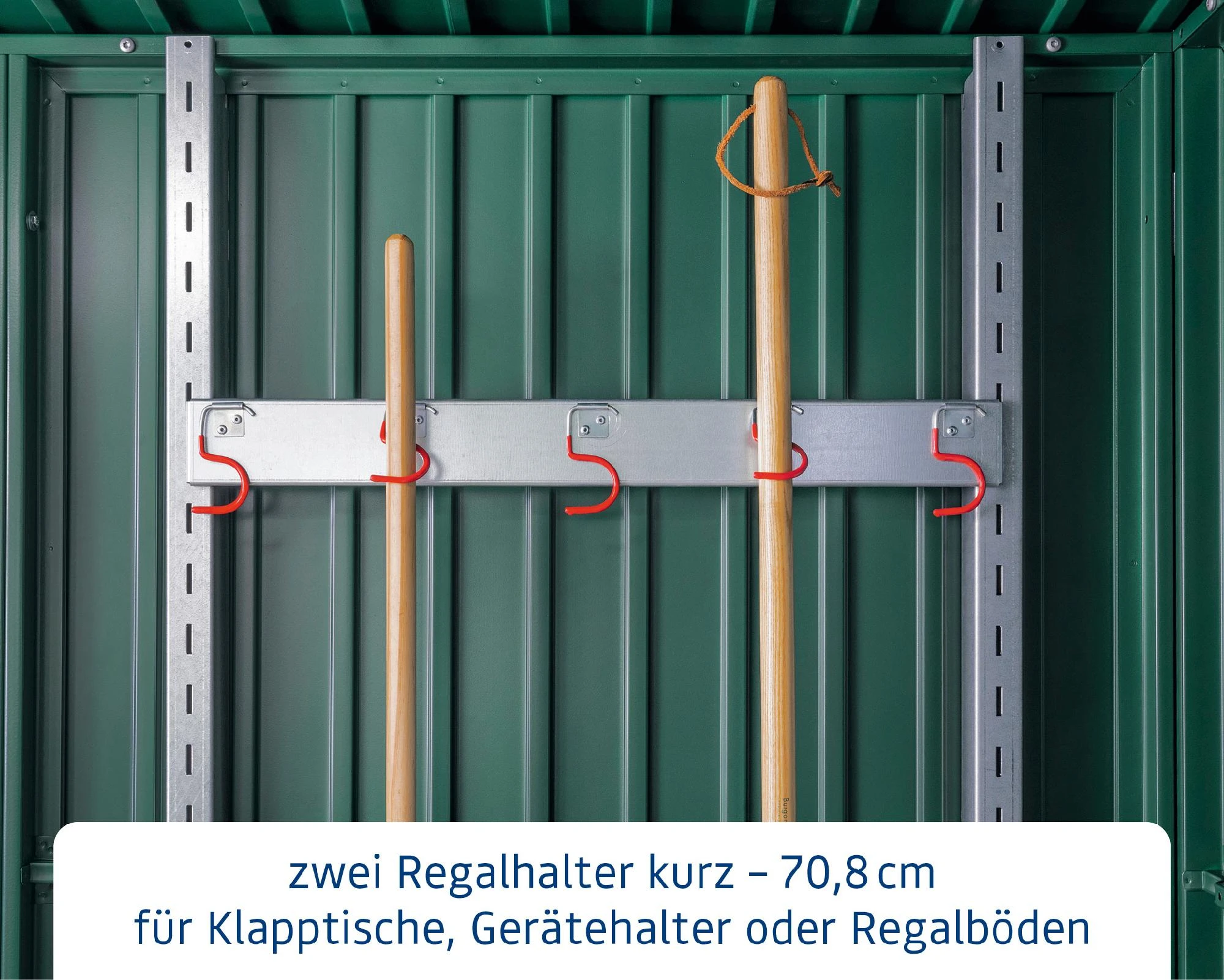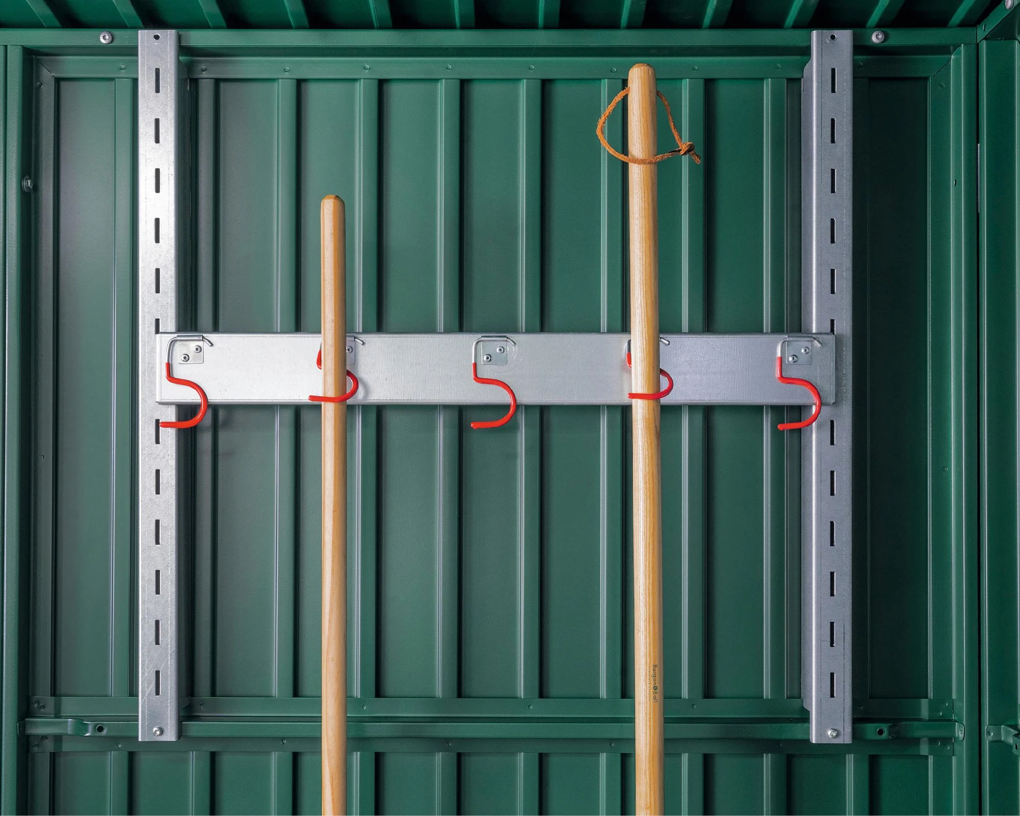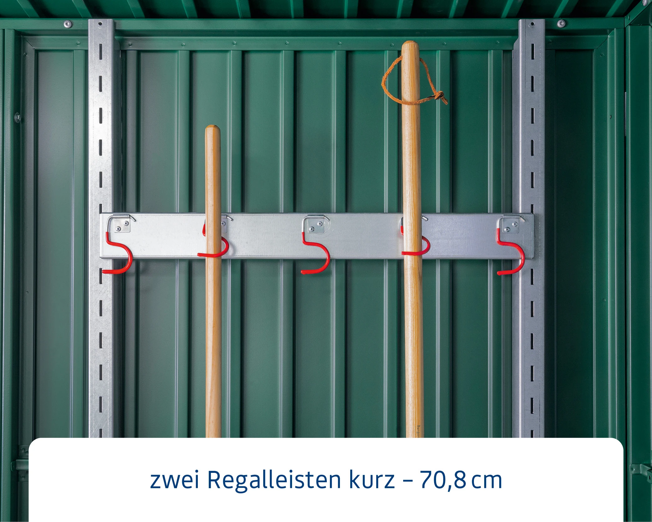 Für den nötigen Halt in Ihrem EcoStar Gerätehaus sorgen die EcoStar Regalleisten aus feuerverzinktem Metall. Sie lassen sich auch im Nachhinein einfach anbringen und bilden eine stabile Basis, um Gerätehalter oder Regalböden daran anzubringen. Die Regalleisten sind 70,8 cm lang und bis zu max. 25 kg belastbar. Im Paket enthalten sind 2 Regalleisten.