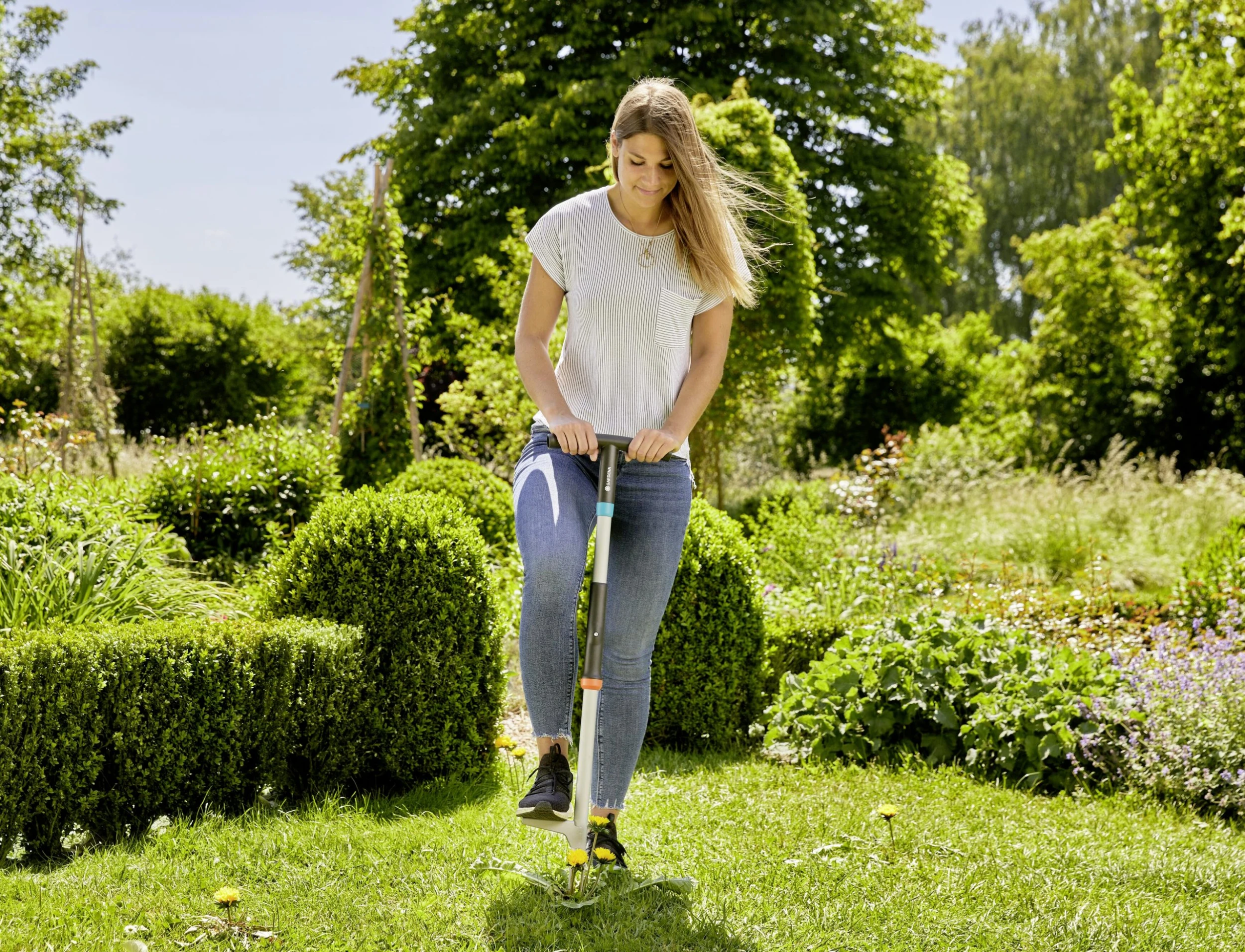 Der GARDENA Unkrautstecher eignet sich optimal für das einfache und präzise Entfernen von Unkraut, vor allem von Löwenzahn im Rasen. Die zwei patentierten Spezialmesser liegen dicht beieinander, ermöglichen ein leichtes Eindringen in den Boden und müheloses, vollständiges Herausziehen des Unkrauts. Dadurch entstehen auch nur kleine Löcher. Der Fußtritt erleichtert zusätzlich das Einstechen in den Boden. Der speziell geformte Griff unterstützt die Kraftübertragung beim Drehen. Der integrierte Auslösemechanismus erleichtert das Auswerfen des Unkrauts – ohne Bücken und schmutzige Hände.
