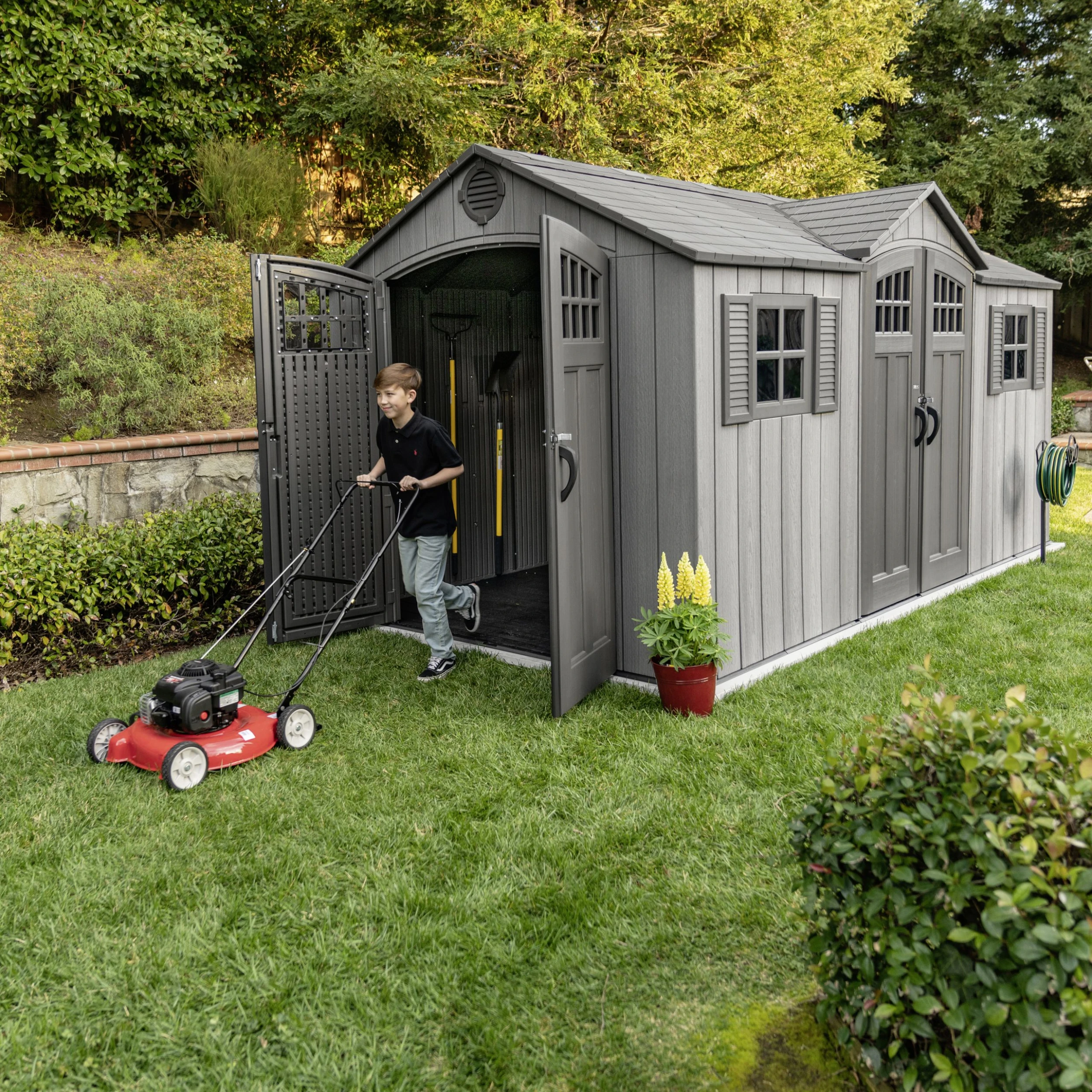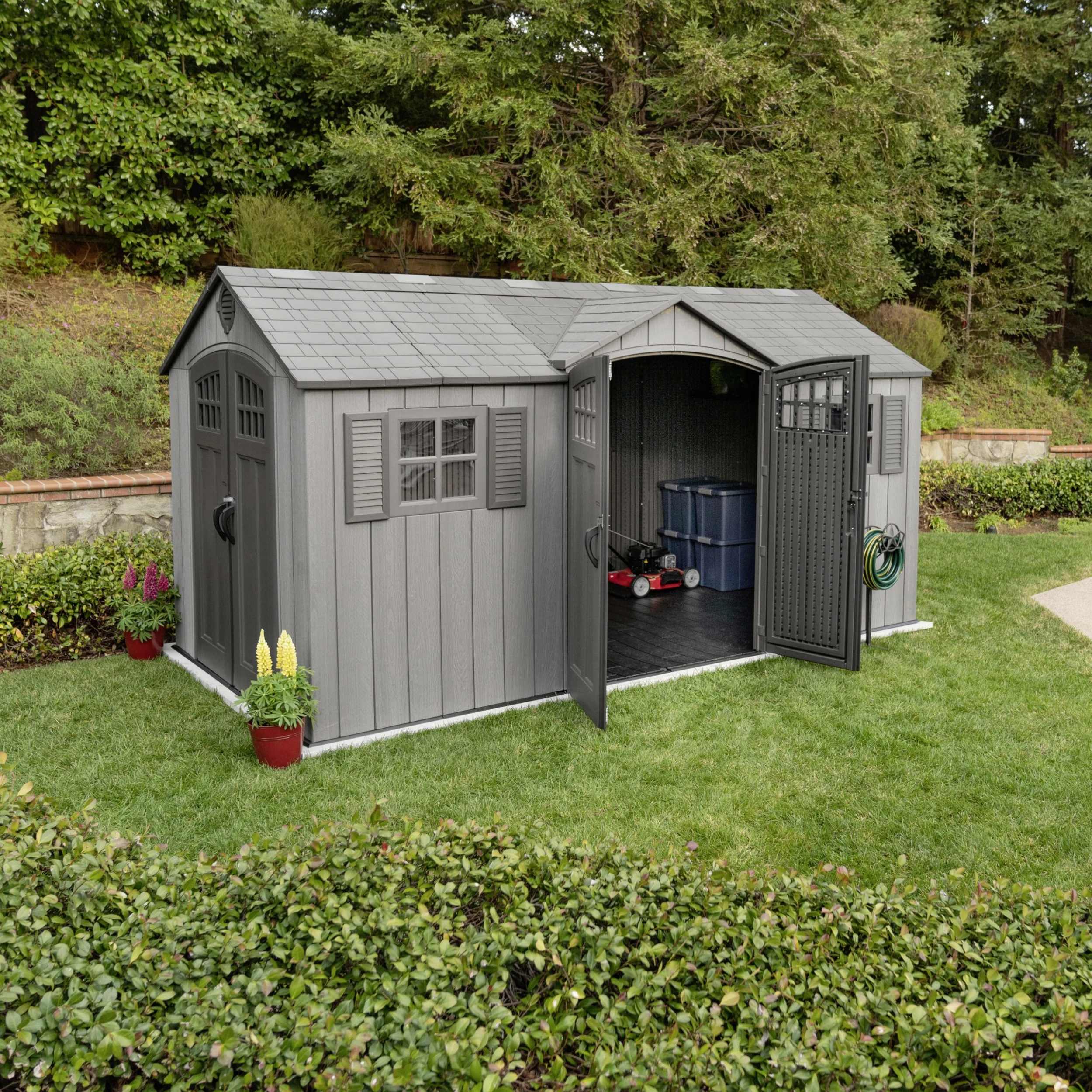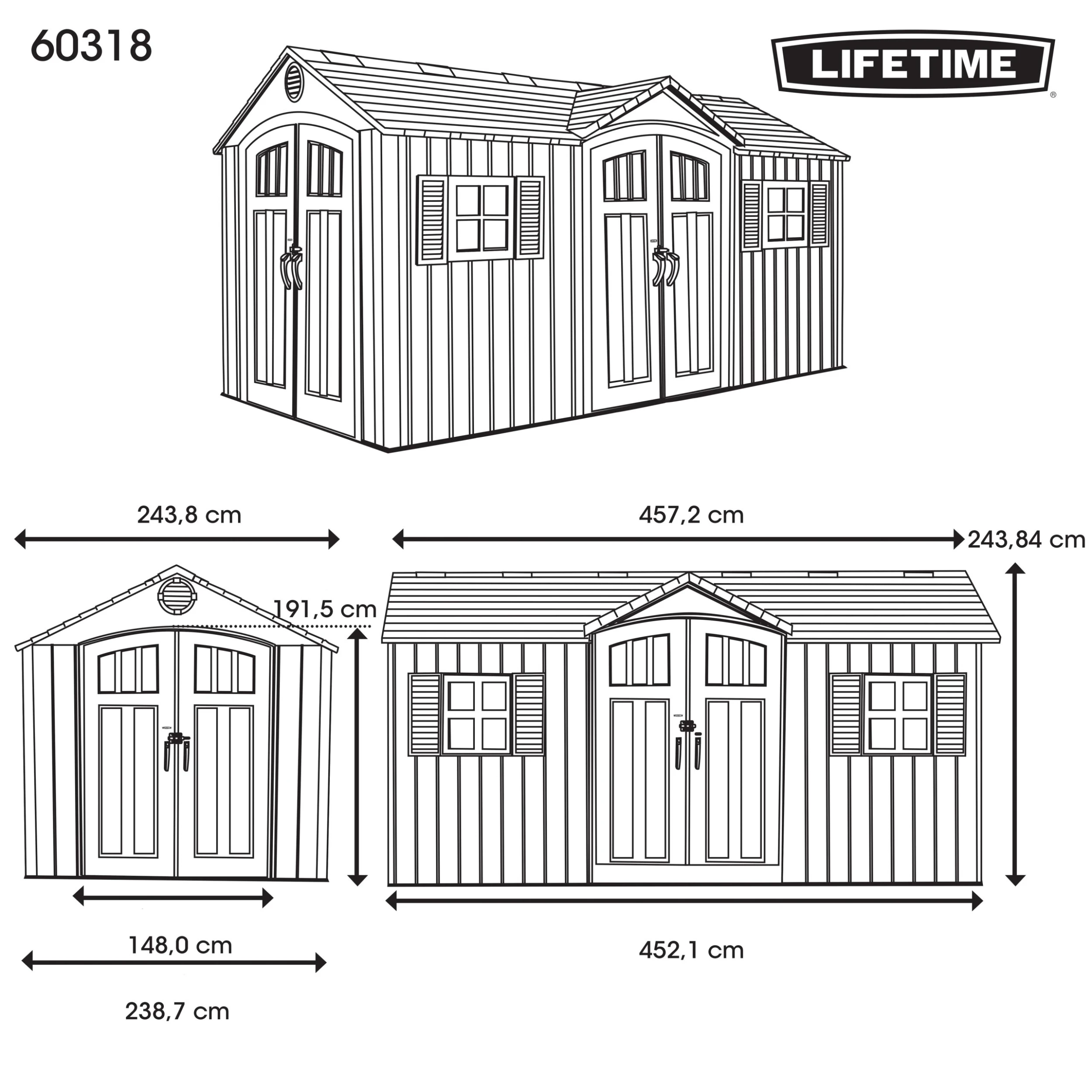 - Außenmaß inkl. Dachvorsprung: (Breite/Tiefe/Höhe) 457 x 244 x 244 cm