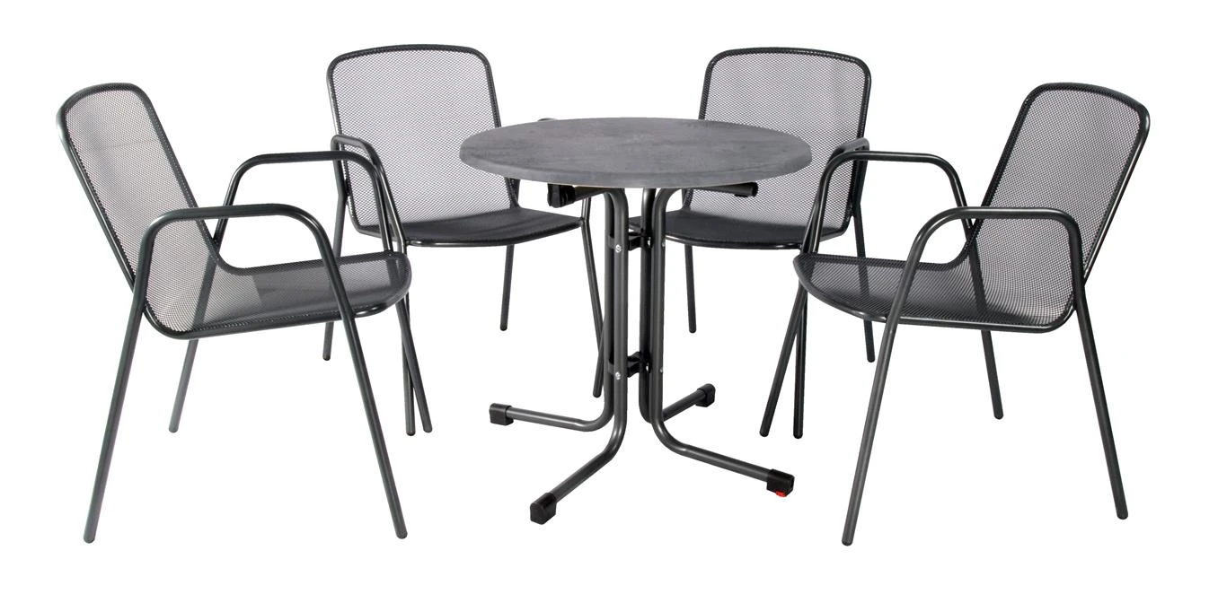 Das Bistroset Mec Fredo aus stabilem, pulverbeschichteten Stahl in Anthrazit überzeugt durch Sitzkomfort und Zweckmäßigkeit. 5-teilig: 4 Stk. Streckmetall-Stapelstuhl “Mec-Fredo” + 1 Stk. Boulevardklapptisch d=70 cm mit wetterfester Topalit-Tischplatte, Gestellfarben: anthrazit, Plattendekor: beton