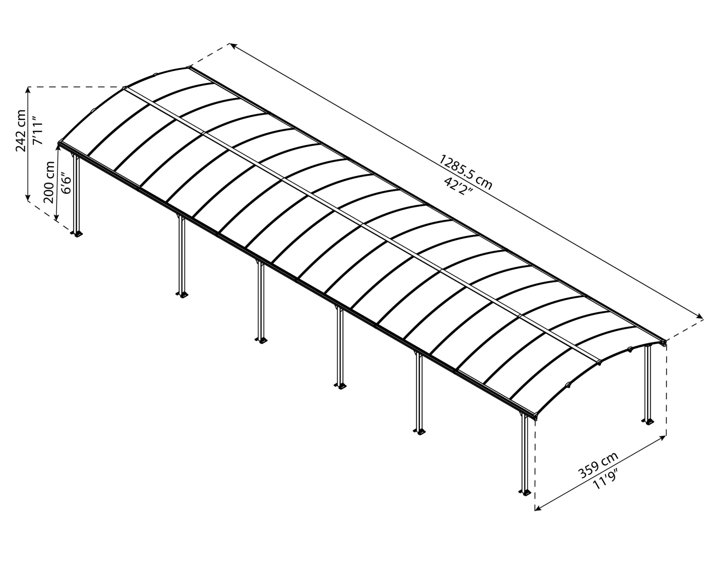 Dieser robuste Carport Arcadia Alpine 12700 besticht durch sein ansprechendes Design. Die massive Konstruktion aus pulverbeschichtetem Aluminium in Kombination mit 6 mm starken, bronzefarbenen Polycarbonatplatten, bietet Ihrem Auto oder Wohnmobil optimalen Schutz vor Umwelteinflüssen wie Regen, Hagel oder UV-Strahlung. Je nach Größe Ihres Fahrzeuges kann zwischen zwei Höhen gewählt werden. Option A mit einer Höhe von 2,60 m ist für normal große Fahrzeuge passend. Benötigen Sie jedoch einen Schutz für ein größeres Fahrzeug, wie beispielsweise Ihr Wohnmobil, können Sie den Carport ganz einfach auf eine Höhe von 3,05m anpassen. Eine Regenrinne ermöglicht den Wasserablauf. Nie wieder streichen, kein Rost, kein Verwittern. Trägt Schneelasten bis zu 150kg/m²! Durch ein neuartiges Verbindungssystem der Platten und Profile gelingt der Aufbau im Handumdrehen. Es werden keine besonderen Fähigkeiten oder Werkzeuge benötigt. Der Carport kann auch als Pavillon genutzt werden. Schaffen Sie einen besonderen Ort für Ihr Fahrzeug: