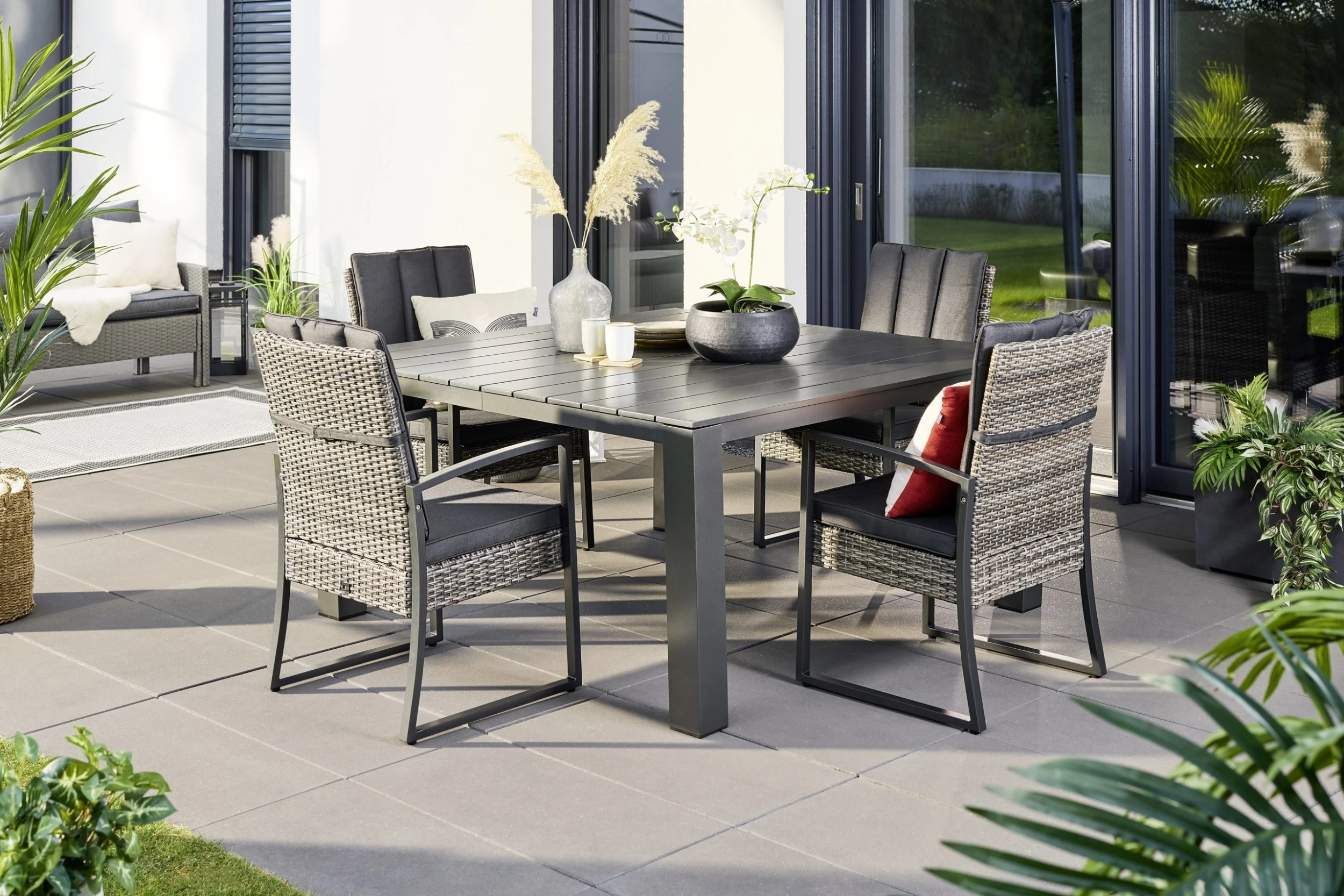 Der Aluminium Esstisch Marseille ist wetterfest und sehr leicht zu reinigen. Das anthrazit farbene Gestell und die Aluminium Belattung verleiht dem Dining Tisch einen modernen Flair und macht ihn zu einem echten Allrounder. Durch das quadratische Design des Tisches mit der Abmessung 152 x 152 cm finden bis zu 8 Personen Platz.