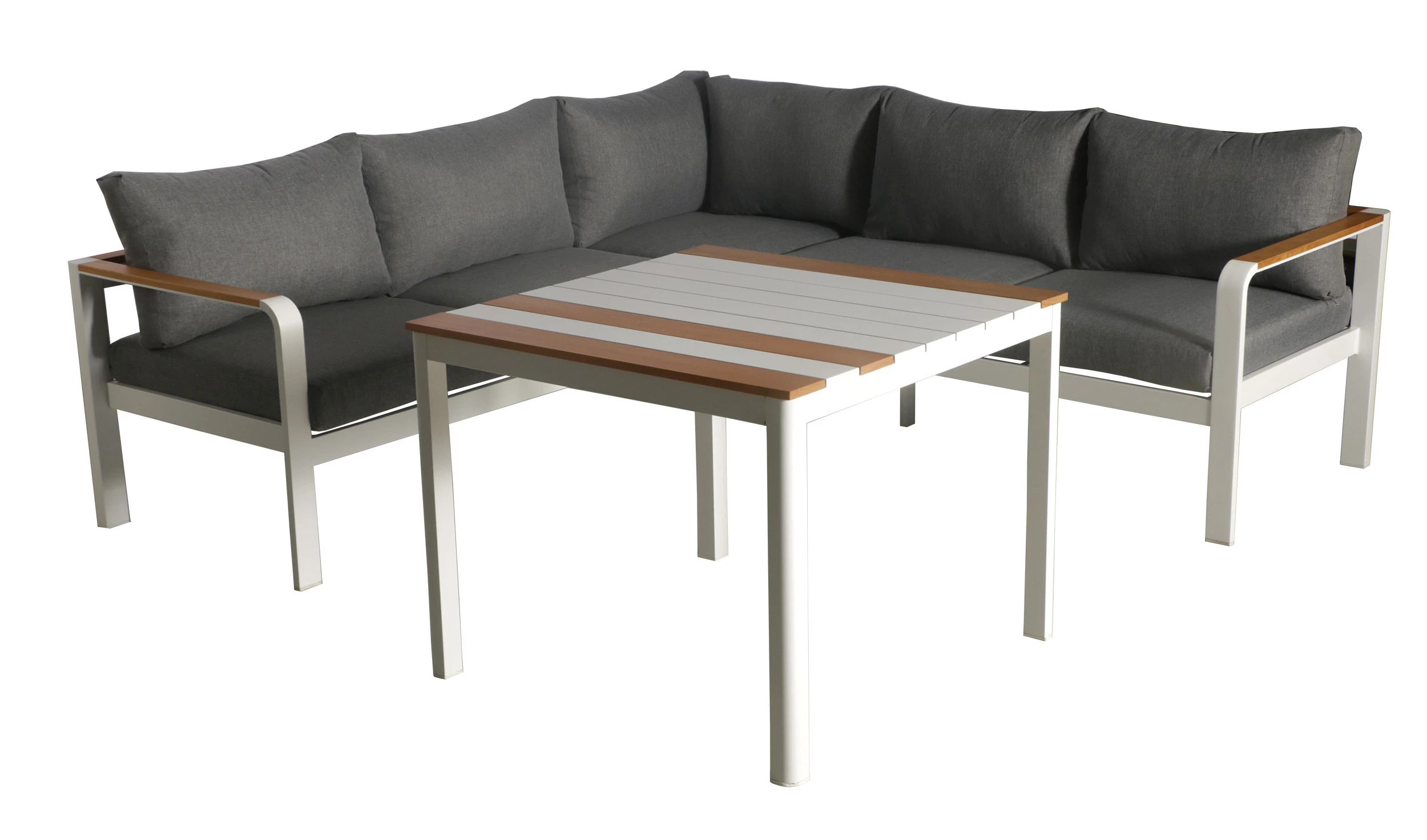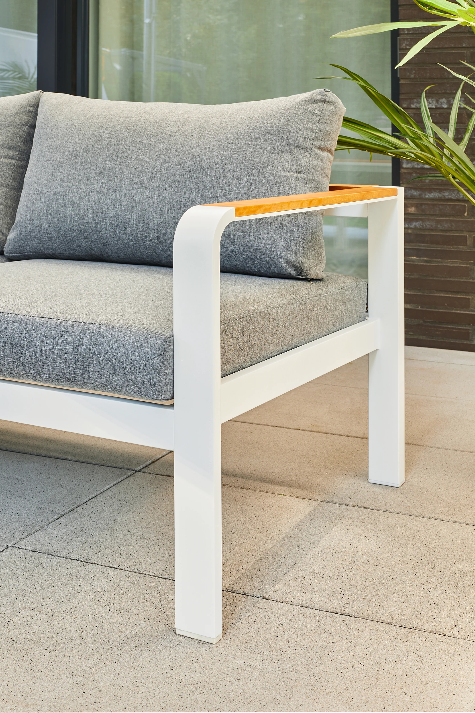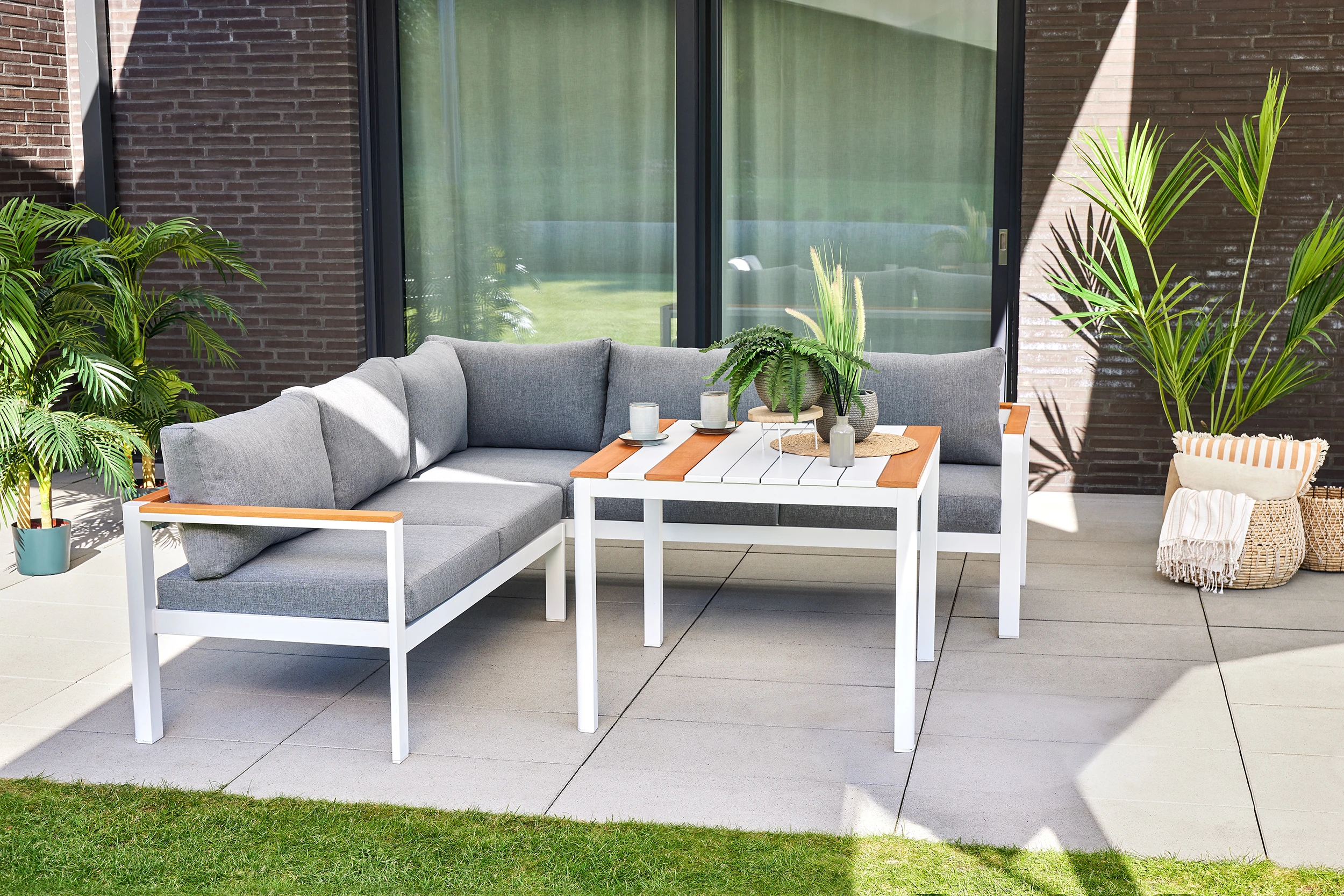 Dieses moderne Möbelset Amilia der Marke Primaster bietet besten Komfort für gemütliche Sommerabende. Die hohe Ausführung macht das Essen mit dieser Lounge problemlos möglich. Die Kombination aus Eukalyptusholz und dem weißen Alu Rahmen runden die Lounge perfekt ab. Die Kissen sind farblich abgestimmt und bieten ein bequemen Sitzkomfort. 3-teiliges Set bestehend aus: 1 Dreisitzer-Sofa, 1 Zweisitzer-Sofa 1 Tisch Pulverbeschichteter Aluminium-Rahmen Weiß inkl. Sitz- und Rückenkissen