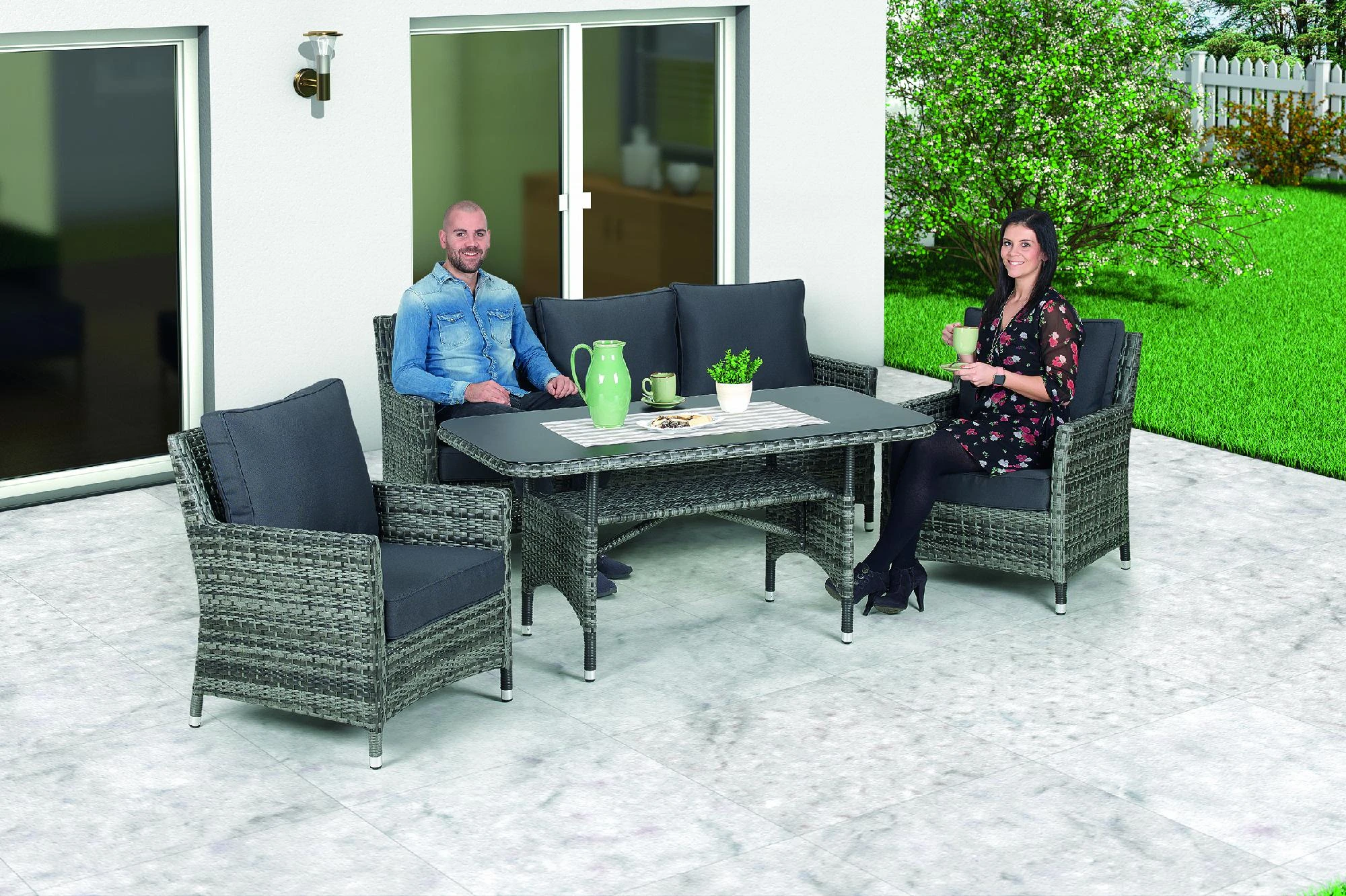 Dieses schöne Dining Lounge Set Laredo der Marke Primaster ist ein Hingucker für jede Terrasse. Sie punktet nicht nur durch das ansprechende Design in der Farbe black pearl, sondern auch durch ihren bequemen Sitzkomfort. Genießen Sie angenehme Stunden unter freiem Himmel. Das Set bestehend aus einer 3-Sitzerbank, zwei Sesseln und einem Tisch mit aufliegender Strukturglasplatte. Der Tisch ist dank seiner Höhe auch optimal als Esstisch geeignet.