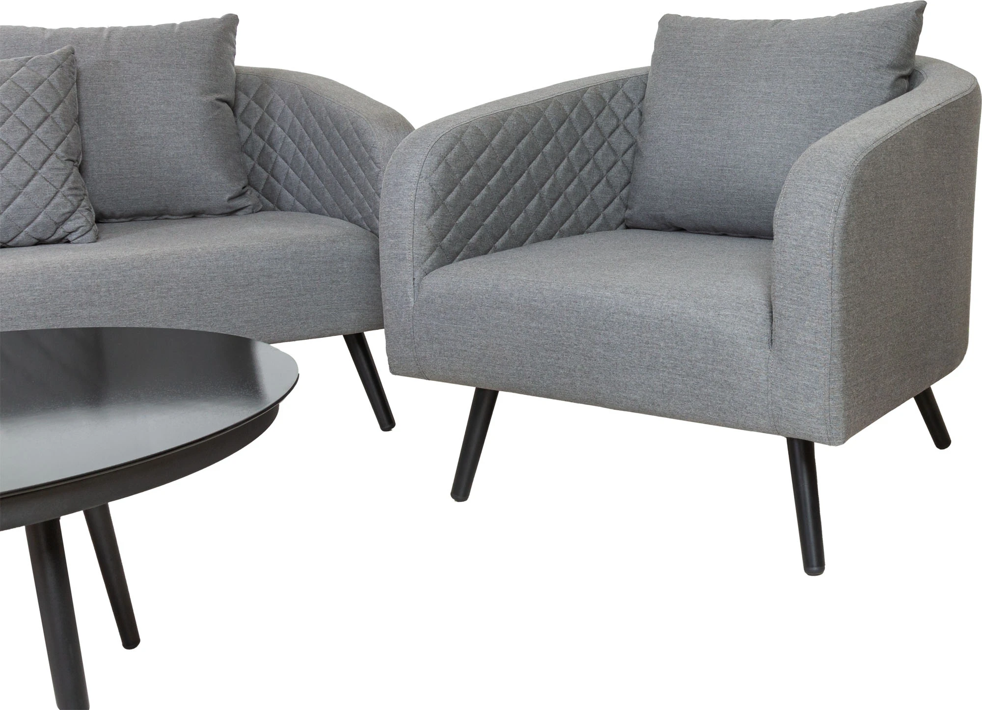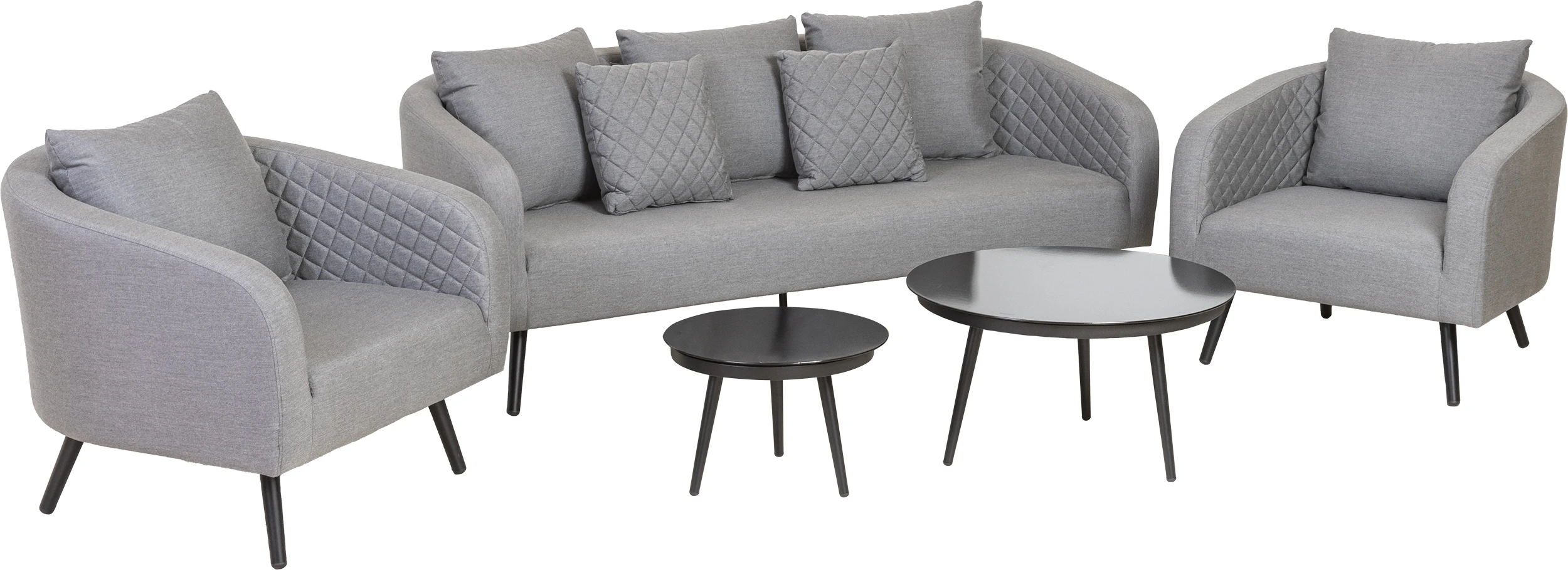 Mit diesem Sofa Set kann der Sommer kommen. GenieĂen Sie schöne Momente mit dieser Garnitur im Retro Style. Die Auflage aus atmungsaktiven SunbrellaÂź Bezug sorgt fĂŒr besten Komfort und ist obendrein pflegeleicht und witterungsbestĂ€ndig. Die hochwertige FĂŒllung der Auflage ist aufgrund groĂer, offener Poren wasserdurchlĂ€ssig und trocknet durch maximale Luftzirkulation besonders schnell. Die beiden Tische, in der Farbe schwarz, haben unterschiedliche MaĂe und bilden ein stimmiges Duo. Das Set bietet im Innenbereich sowie auf der Terrasse hohen Komfort und Entspannung pur.