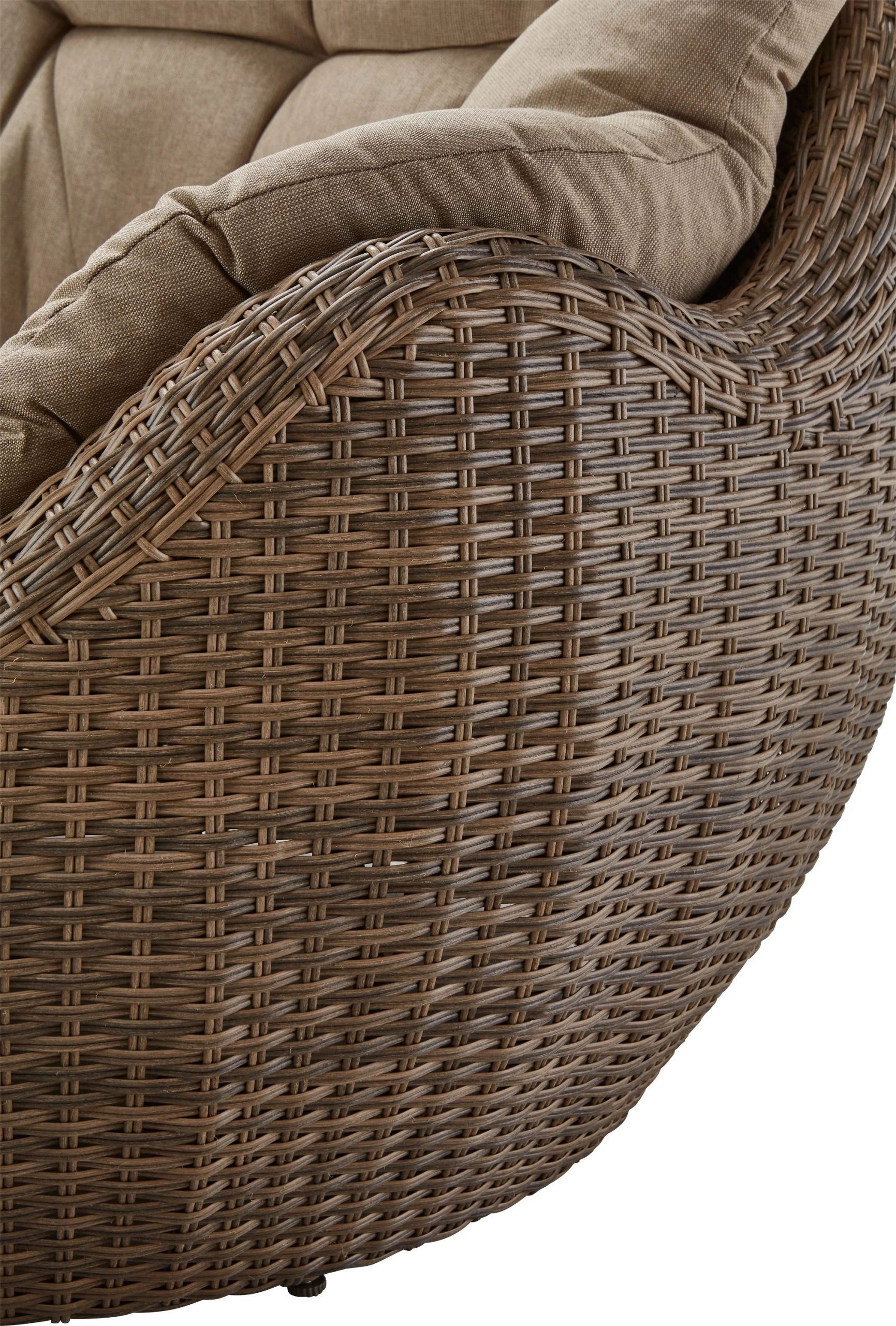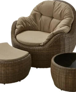 Dieses 3-teilige Set aus witterungsbeständigem Kunststoffgeflecht ist pflegeleicht und bietet dank seiner dicken Polsterauflagen einen sehr bequemen Sitzkomfort. Der Fusshocker und der kleine Ablagetisch machen dieses Set perfekt für gemütliche Stunden auch auf der kleinsten Terrasse.