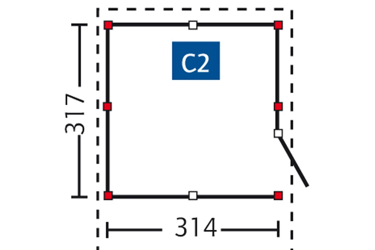Breite: 314 cmTiefe: 317 cmHöhe: 200 cmTür (Durchgangsmaß 94 x 190 cm)Stärke: 20 mmPfosten inklusive H-PfostenankerRot markierte Pfosten sind carportseitig bereits vorhandenbei Einbau unter einem Carport mit kleinerer Durchfahrtsbreite einfach bauseits anpassenMaterial: FichteGrün imprägniert