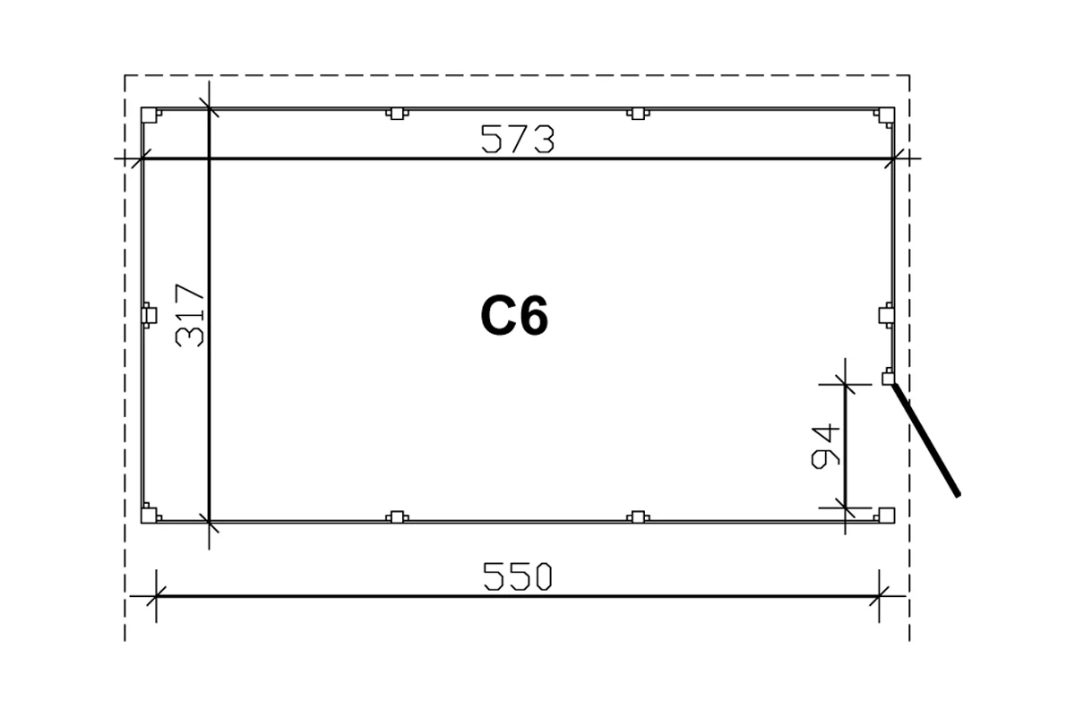 Breite: 573 cmTiefe: 317 cmHöhe: 200 cmTür (Durchgangsmaß 94 x 190 cm)Stärke: 20 mmPfosten inklusive H-PfostenankerRot markierte Pfosten sind carportseitig bereits vorhandenbei Einbau unter einem Carport mit kleinerer Durchfahrtsbreite einfach bauseits anpassenMaterial: FichteGrün imprägniert