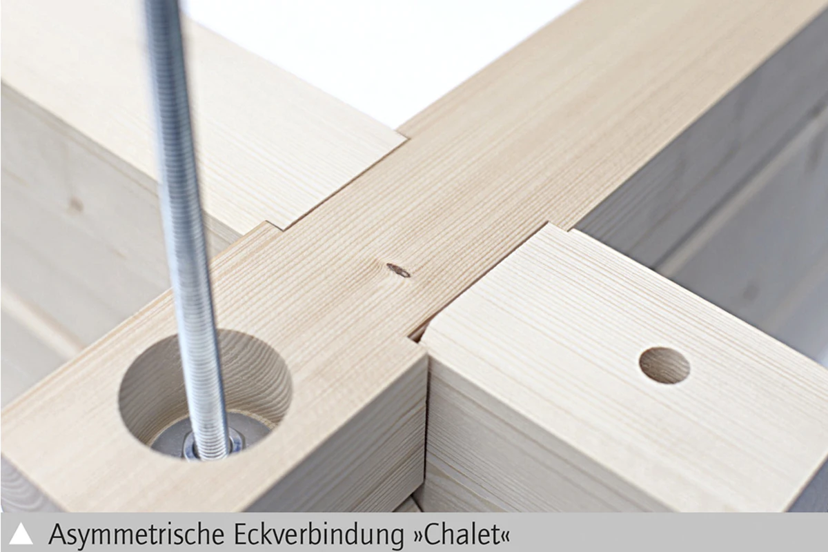 Alle 45 mm starken Wandbohlen haben eine Doppelnut- und Federfräsung. Die Bohlen werden einfach ineinander gesteckt. Die Passgenauigkeit der Bohlen beim Aufbau wird durch moderne Frästechnik und einer asymmetrischen Eckverbindung erreicht. Durch diese ist eine einfache Montage des Hauses gewährleistet.