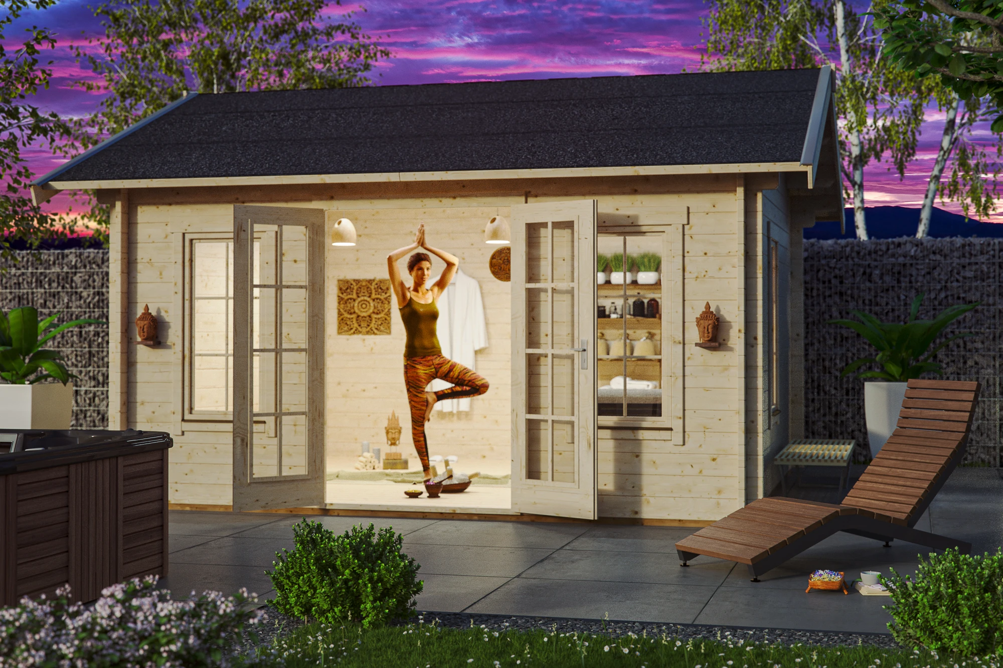Größe 420 x 380 cmfarblich unbehandelthochwertiges nordisches Fichtenholz4-seitig gehobelte 70 mm Wandbohlen mit Dreifachnut und FederChalet-Eckfräsungen und unsichtbaren WindverbandFußboden 28 mm inkl. imprägnierten GrundlagernTüren und Fenster mit Isolierglas und Gummidichtung sowie aufgesetztem Sprossenrahmen (Sprossenrahmen können wahlweise montiert oder weggelassen werden)Tür mit Profilzylinderschloss und 3 SchlüsselnDurchgangsmaß Tür B x H 142 x 196 cmFenster mit Aluminium-Abtropfkante und Dreh-Kipp-BeschlagDach 19 mm Profilschalung mit Nut und Feder sowie Konterlattung und Lattung (für Dachziegel vorgesehen)