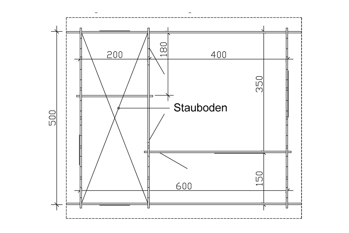 Der Fußboden besteht aus unbehandelten 19 mm Holz-Dielen mit Nut und Feder inkl. imprägnierten Grundlagern.