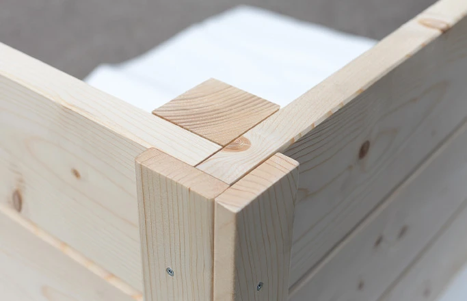 Die Konstruktion ist aus massiver nordischer Fichte gefertigt. Hier verwenden wir technisch getrocknetes, massives Fichtenholz, welches auf Fehler gescannt, sortiert und in der Länge nach wetterfest durch Keilzinken miteinander verleimt wurde. Kleinere Risse, Äste und leichte Verdrehungen spiegeln den Charakter der eingesetzten Materialien wider.