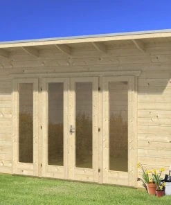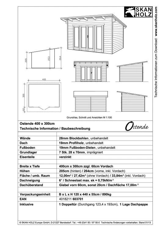 Größe 400 x 300 cmfarblich unbehandelthochwertiges nordisches Fichtenholz4-seitig gehobelte 28 mm Wandbohlen mit Einfachnut und FederSteck-Schraub-EckverbindungFußboden 19 mm inkl. imprägnierten GrundlagernTür und Fenster mit EchtglasTür mit Profilzylinderschloss und 3 SchlüsselnDurchgangsmaß Tür B x H 123,4 x 193 cmDie Panoramafenster sind feststehend, Glasscheibe durch Lösen von Schnappverschlüssen herausnehmbarDach 19 mm Profilschalung mit Nut und Feder sowie Aluminiumabschlusskante, inkl. 1 Lage Dachpappe zur ErsteindeckungAufgrund geringer Dachneigung Eindeckung mit Dachschindeln nicht möglich (KSK-M Dachbahnen sind optional als Zubehör erhältlich)