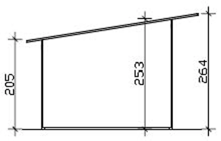 Das Dach besteht aus 19 mmDachschalung und einer Aluminium-Abschlusskante. Aufgrund der geringen Dachneigung ist eine Eindeckung mit Dachschindeln nicht möglich. Wir empfehlen die Eindeckung mit KSK-M Dachbahnen (sind optional als Zubehör erhältlich). Das Gefälle verläuft nach hinten.