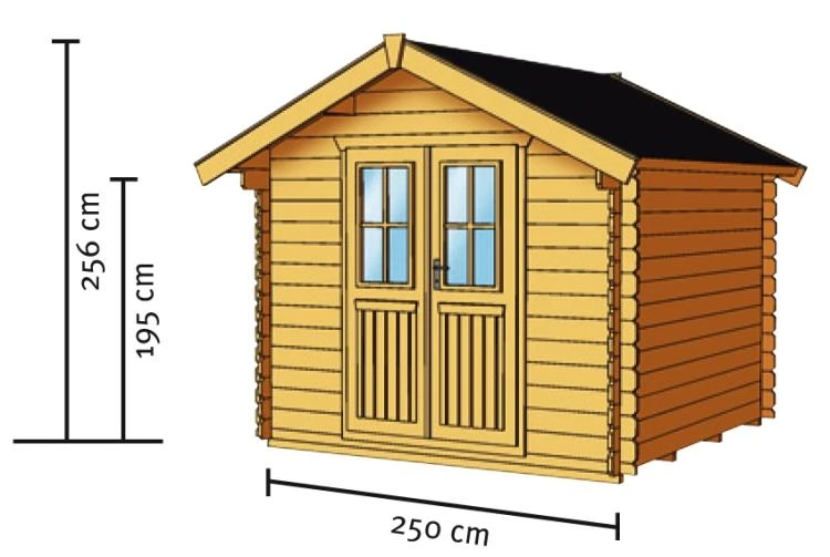 Größe 250 x 300 cmfarblich unbehandelthochwertiges nordisches Fichtenholz4-seitig gehobelte 28 mm Wandbohlen mit Einfachnut und Federprofilierte Eckverbindungen und unsichtbarer WindverbandFußboden 19 mm inkl. imprägnierten GrundlagernTür mit Echtglas und aufgesetzten Sprossen (Sprossenrahmen können wahlweise montiert oder weggelassen werden)Profilzylinderschloss mit 3 SchlüsselnDurchgangsmaß Tür B x H 117,5 x 179,5 cmDach 19 mm Profilschalung mit Nut und Feder inkl. 1 Lage Dachpappe zur ErsteindeckungDachschindeln als Zubehör erhältlich