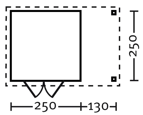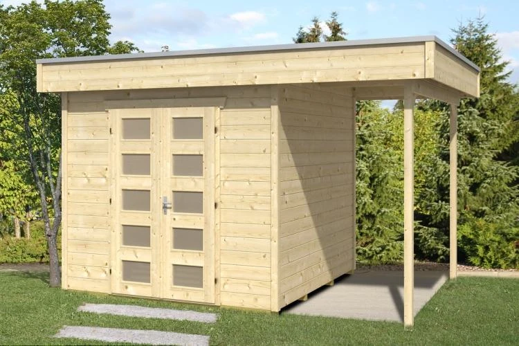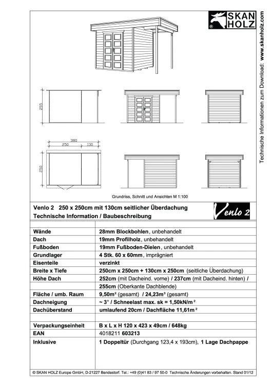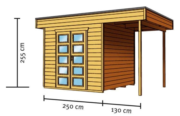 Größe 250 x 380 cmfarblich unbehandeltgeschlossener Raum 250 x 250 cmund seitliche Überdachung 130 x 250cm (links oder rechts montierbar)hochwertiges nordisches Fichtenholz4-seitig gehobelte 28 mm Wandbohlen mit Einfachnut und FederSteck-Schraub-EckverbindungFußboden 19 mm inkl. imprägnierten GrundlagernKassetten-Doppeltür mit echtem MilchglasProfilzylinderschloss mit 3 SchlüsselnDurchgangsmaß Tür B x H 123,4 x 193 cmDach 19 mm Profilschalung mit Nut und Feder sowie Aluminiumabschlusskante, inkl. 1 Lage Dachpappe zur ErsteindeckungAufgrund geringer Dachneigung Eindeckung mit Dachschindeln nicht möglich (KSK-M Dachbahnen sind optional als Zubehör erhältlich)