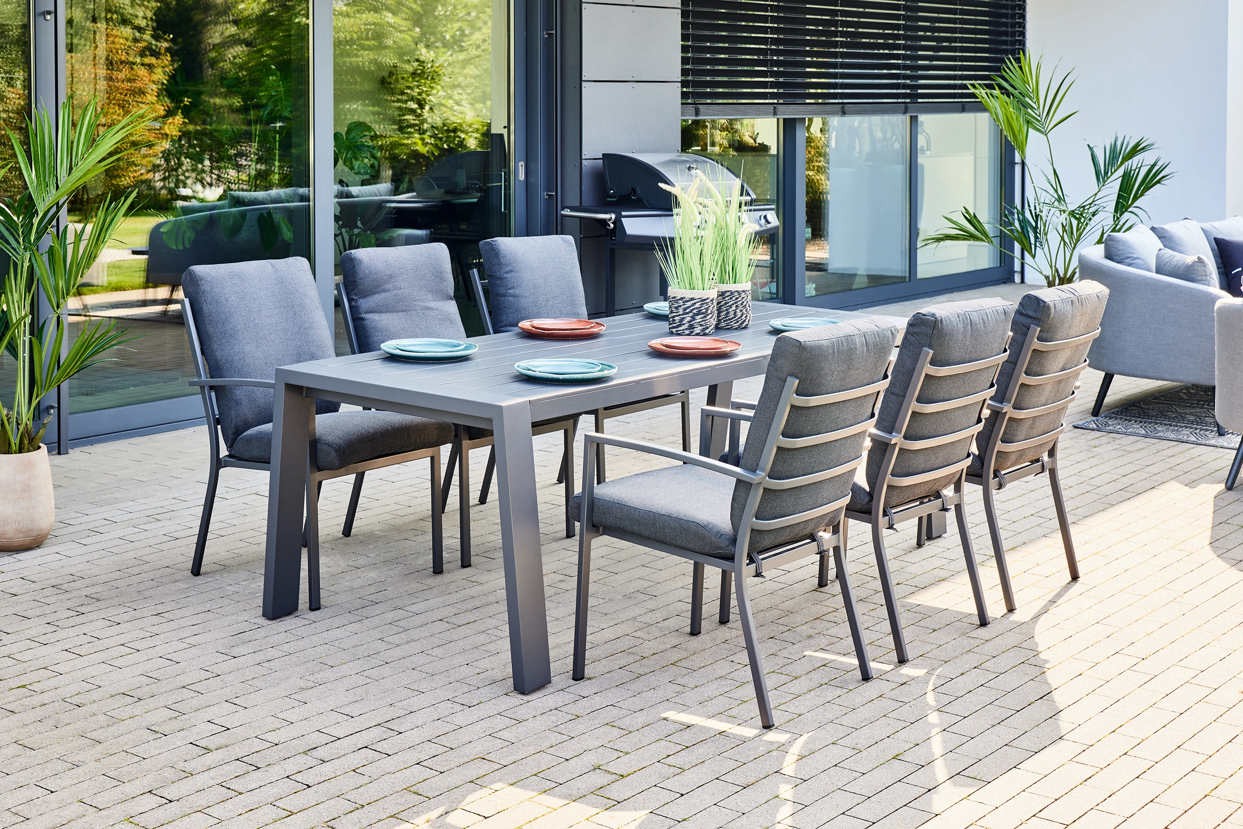 Das Dining Set Hamilton der Marke TrendLine überzeugt durch seine moderne Optik. 6 Stühle inkl. Sitz und Rückenkissen sorgen für einen hohen Sitzkomfort. Dieses Möbelset, aus Aluminium, sorgt für einen angenehmes Ambiente unter freiem Himmel. Der Tisch mit einer Größe von 220 x 83 x72 cm, bietet besten Komfort und Platz für viele Gäste.
